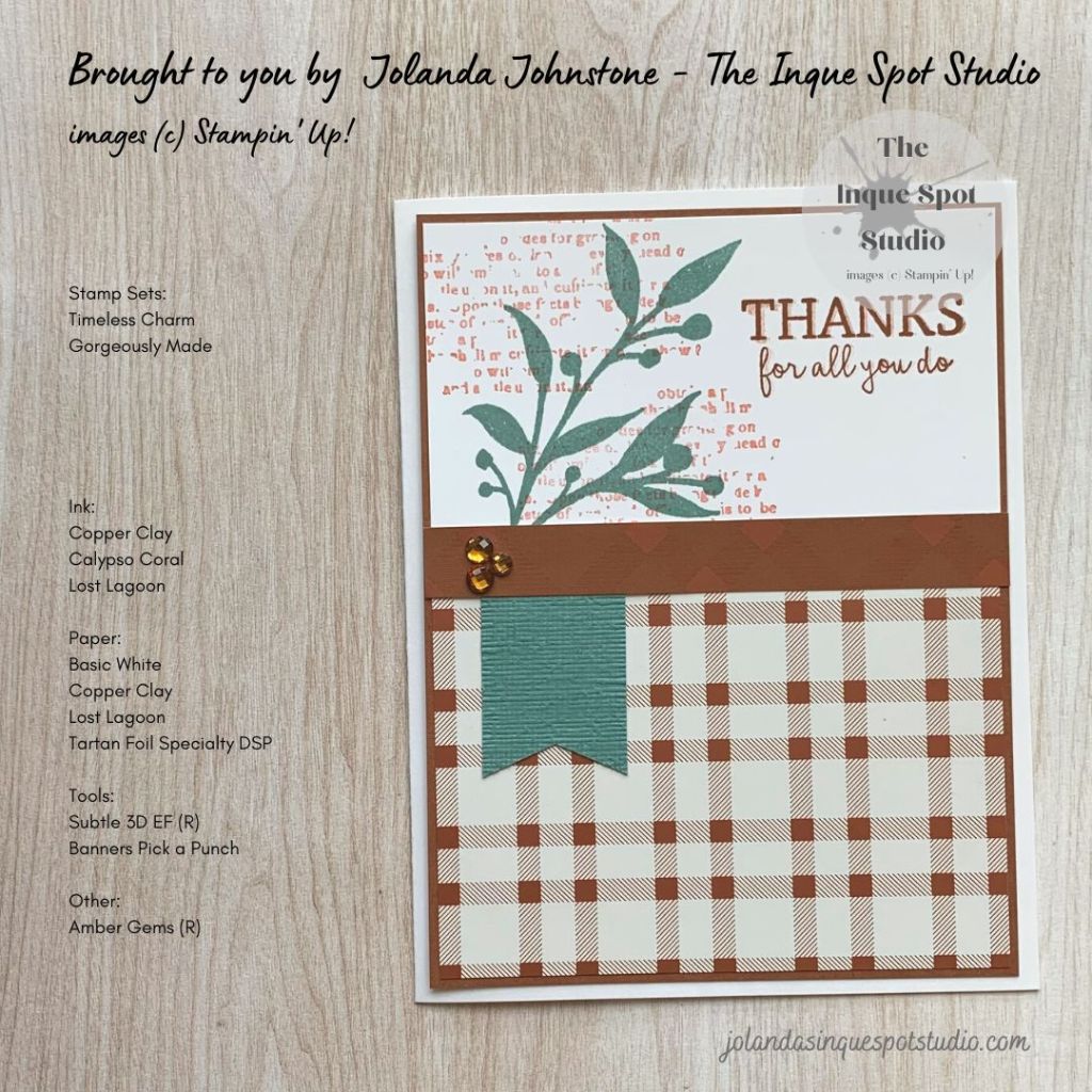 - The sentiment, Thanks for all you do, from the On-Line Exclusive Timeless Charm stamp set was stamped with both 1st Generation and off-set with 2nd Generation Copper Clay ink (for Acorn) for a shadow look.