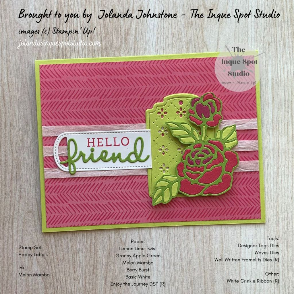- The Hello greeting from the Happy Labels stamp set was stamped with Melon Mambo ink.