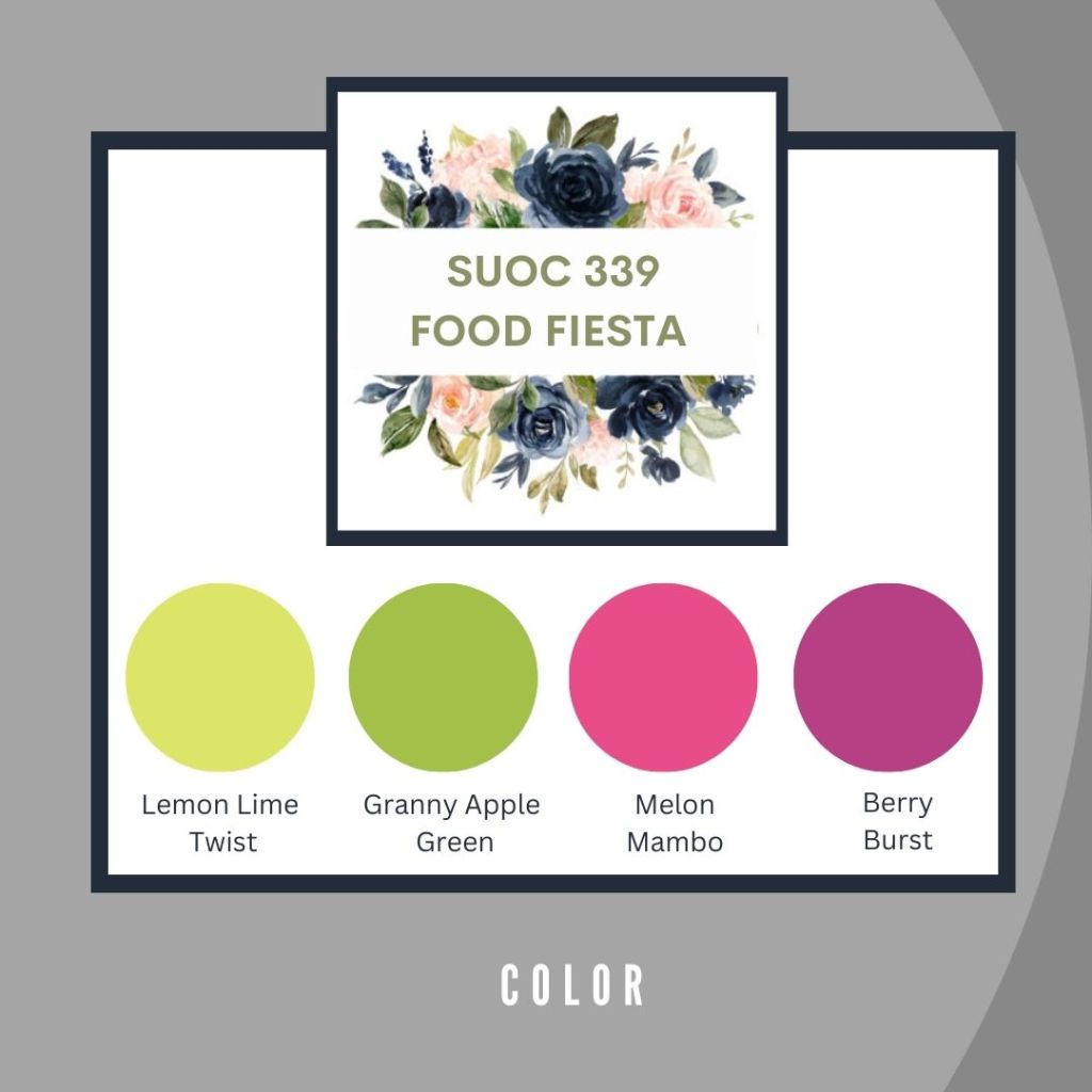 - Decoration – Two Roses: (2½” x 3”) Basic White, Granny Apple Green, Lemon Lime Twist, Melon Mambo and Berry Burst cardstocks.