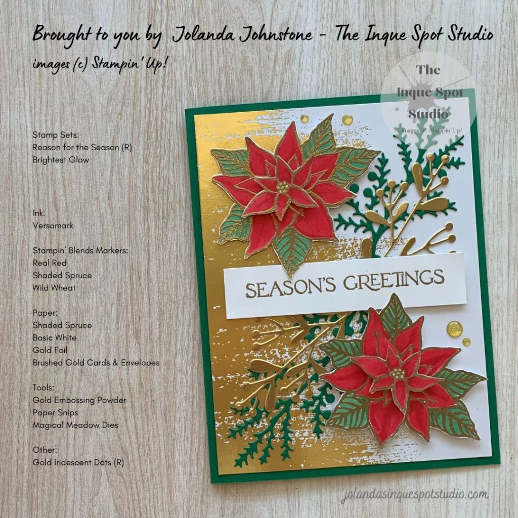 - The Poinsettia image was stamped four (4) times with Versamark ink and heat-set with Gold Embossing Powder.