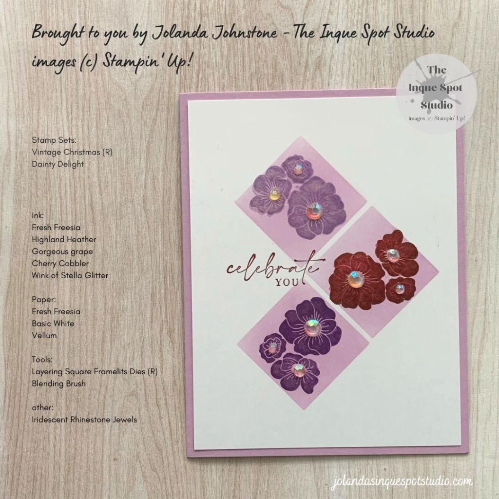 - The Three Blossoms image from the retired Vintage Christmas stamp set was stamped into the Squares with Highland Heather, Cherry Cobbler and Gorgeous Grape inks.