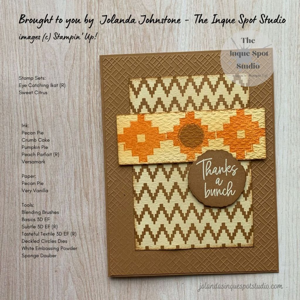 - Other Ikat images from the same stamp set were stamped with Pumpkin Pie ink (for Pumpkin) and a Pecan Pie Circle Spot was added.