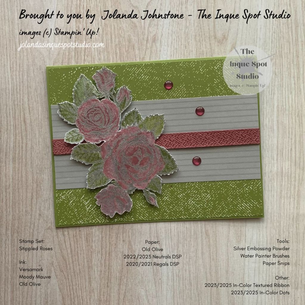 #stampinup, #jolandajohnstone, #theinquespotstudio, #rubberstamping, #stampsinkpaper, #papercrafting, #cardmaking, #diycards, #handmadecards, #cardmakingideas, #craftingideas, #artsandcrafts, #cardmakingsupplies, #craftingsupplies, #makeacardsendacard, #Roses, #Floralcards, #Flowers, #Blankcards, #alloccasioncards, #greetingcards, #StippledRoses, #2020/2021RegalsDSP, #2022/2023NeutralsDSP, #2023/2025In-ColorTexturedRibbon, #2023/2025In-ColorDots, #Versamark, #SilverEmbossingPowder, #embossing, #PaperSnips, #fussycutting, #WaterPainterBrushes, #watercoloring, #BeautifulBlossomsChallenge, #BBC011, #HappyLittleStampersChallenges, #HLSWatercolorDecember2023, #TuesdayMorningSketchesChallenges, #TMS735, #CreativeColourChallenges, #CCC118, #Ellibelle’sCraftyWednesdayChallenges, #ECCDecember2023, #stampinupdemo, #cardmaker, #handmade, #SketchChallenge, #ColorChallenge, #ThemeChallenge, #TechniqueChallenge, #ThemeChallenge,
