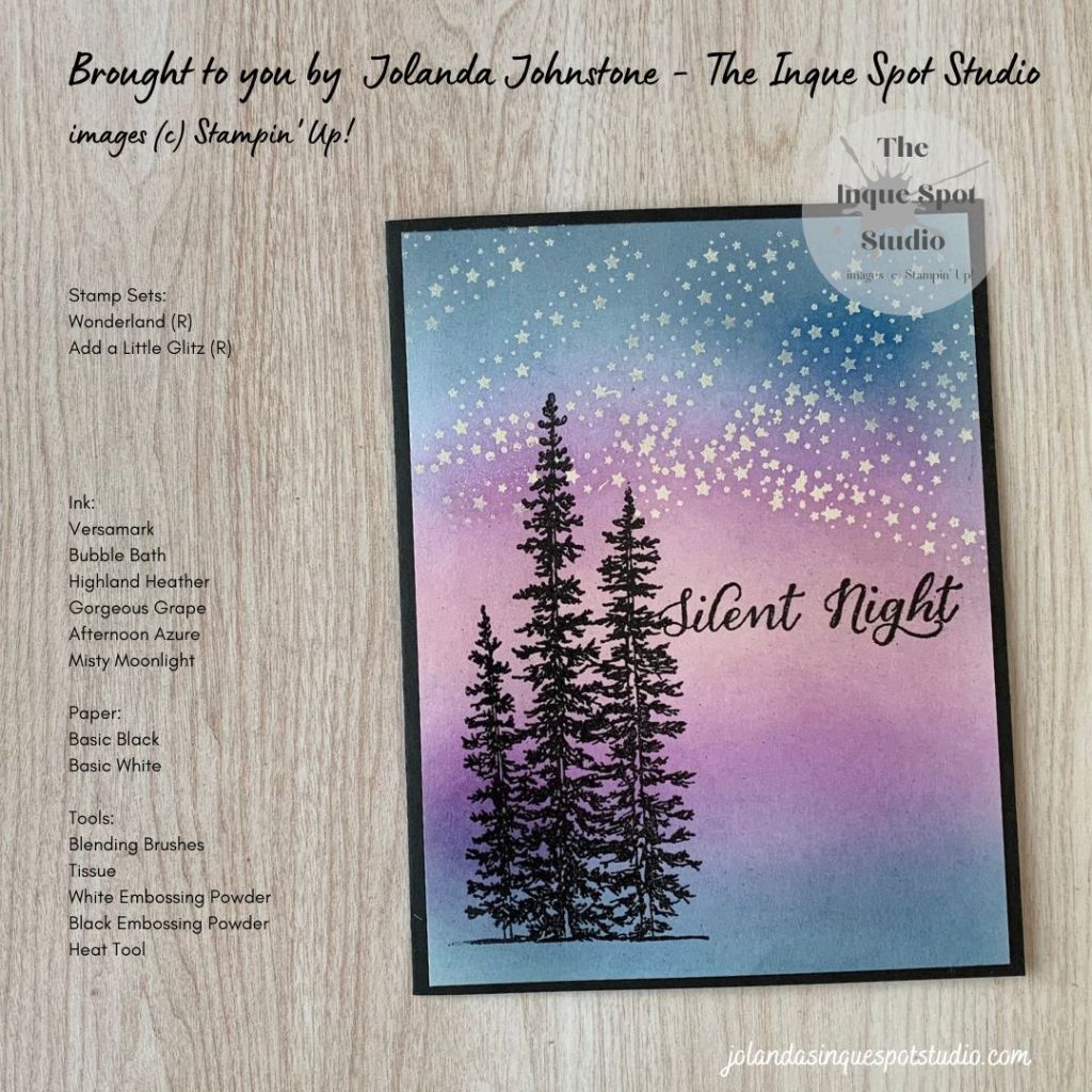 - The Pine Tree image and the sentiment, Silent Night, from the retired Wonderland stamp set was then stamped with Versamark ink and heat-set with Black Embossing Powder.