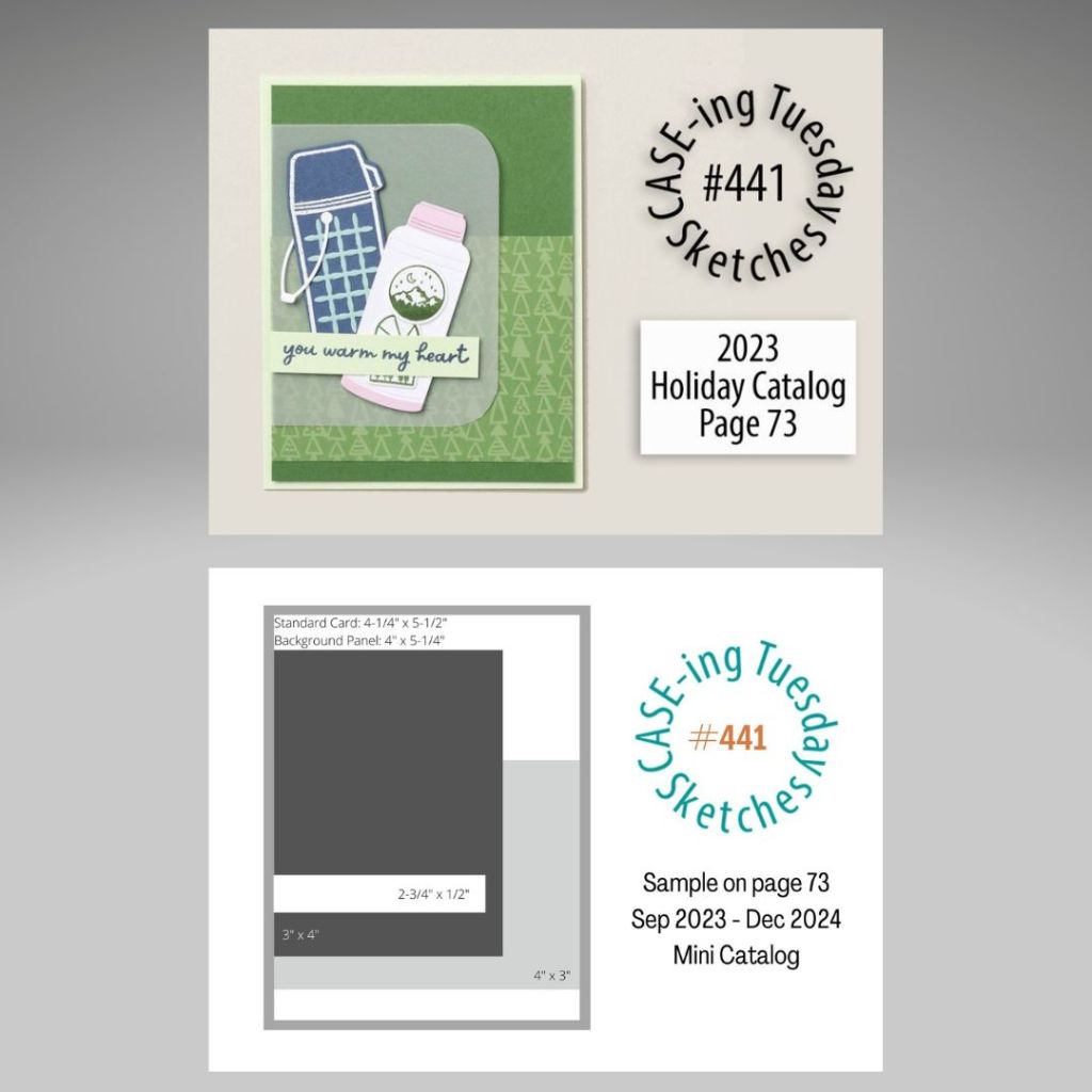 Firstly, I am creating a card for the Facebook Case-ing Tuesday challenge (#441). The last sample card from the September – December Mini Catalog found on page 73. I flipped it to the horizontal position to better accommodate my idea.