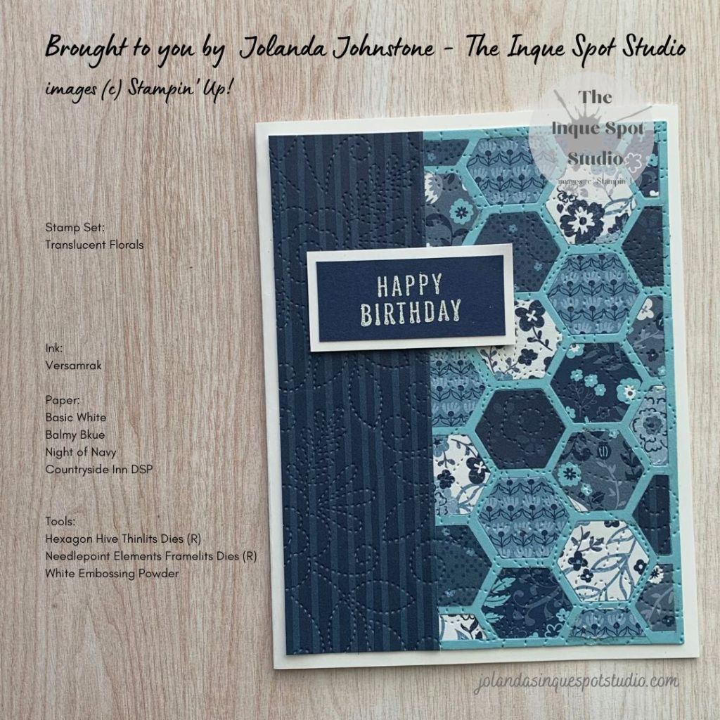 - Right Side Panel – Quilt: (2¾” x 5¼”) Balmy Blue cardstock die-cut with the retired Hexagon Hive Thinlits Die.