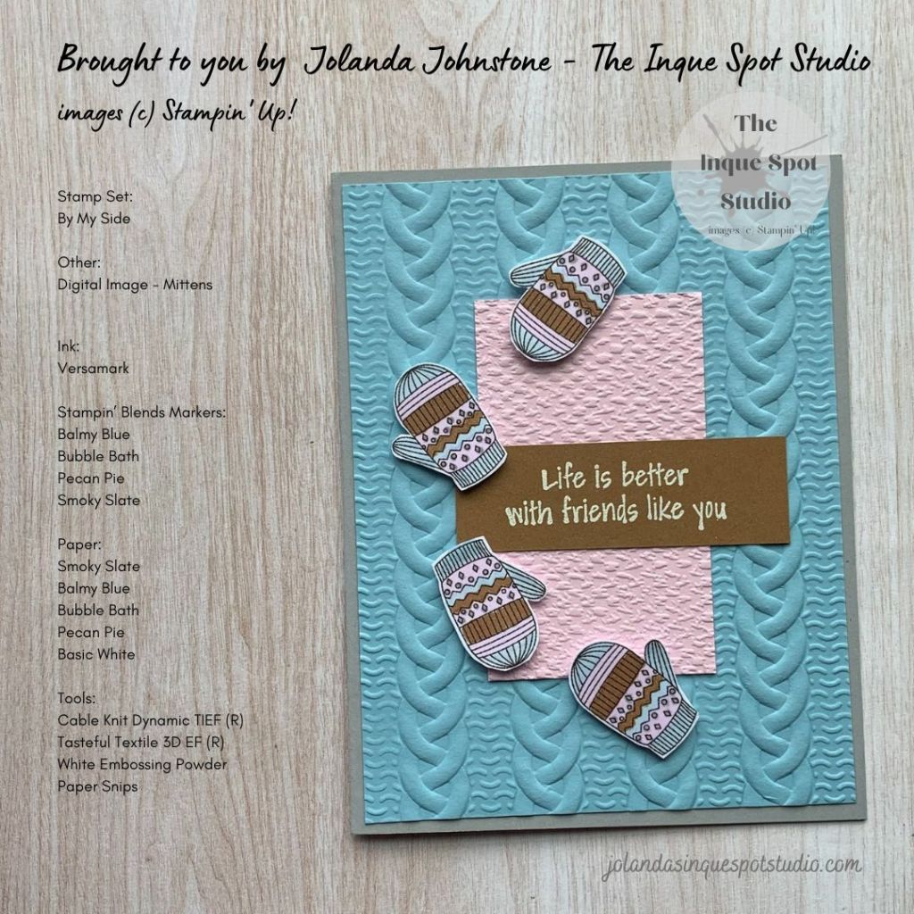 - The Mittens were colored with Light Stampin’ Blends Markers: Colors selected: Balmy Blue (for Periwinkle); Bubble Bath (for Mulberry); Smoky Slate (for Mink) and Pecan Pie as a neutral.
