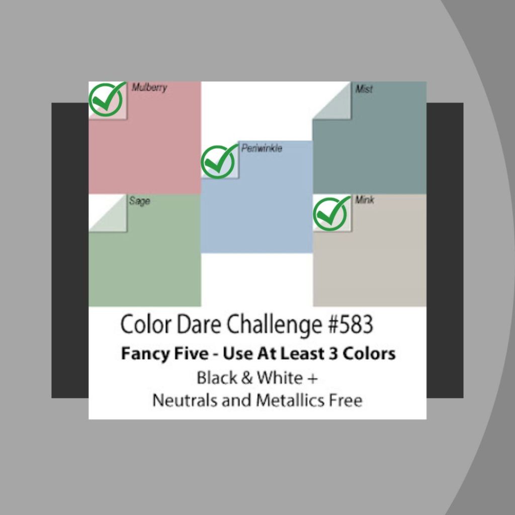My choices were influenced by Inspired By (#271) for the theme, texture and general coloring which tied in well with the Color Dare (#583) Fancy Five Board. I chose to make a birthday card using the techniques / tools suggested by Seize The Birthday (#275).