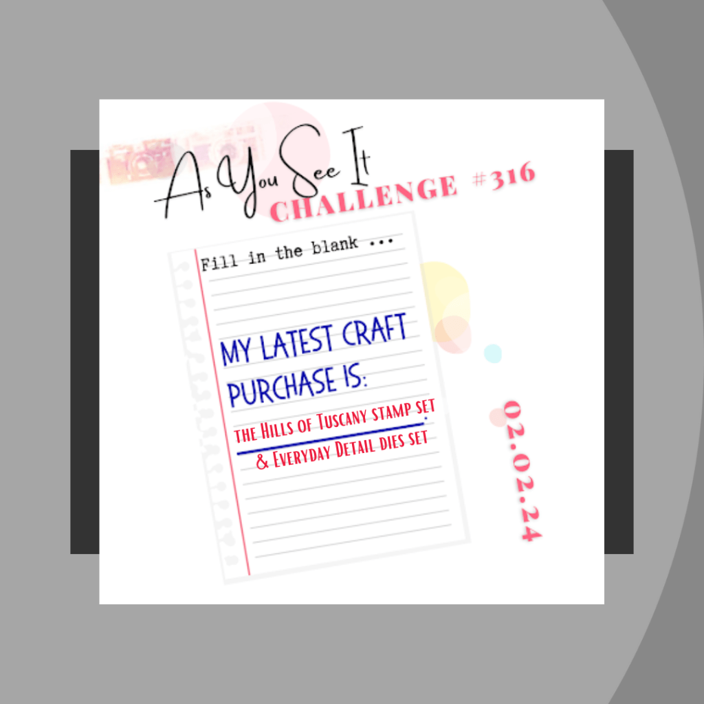 I kept the layout pretty much the same but changed out the stamp set, showcasing the Hills of Tuscany stamp set and the Everyday Details Dies set, two new additions to my collection to play along with As You See It (#316). For the colors, I opted for the Tic Tac Toe Board left column suggested by Color Dare (#585) for a study in Sepia tones.