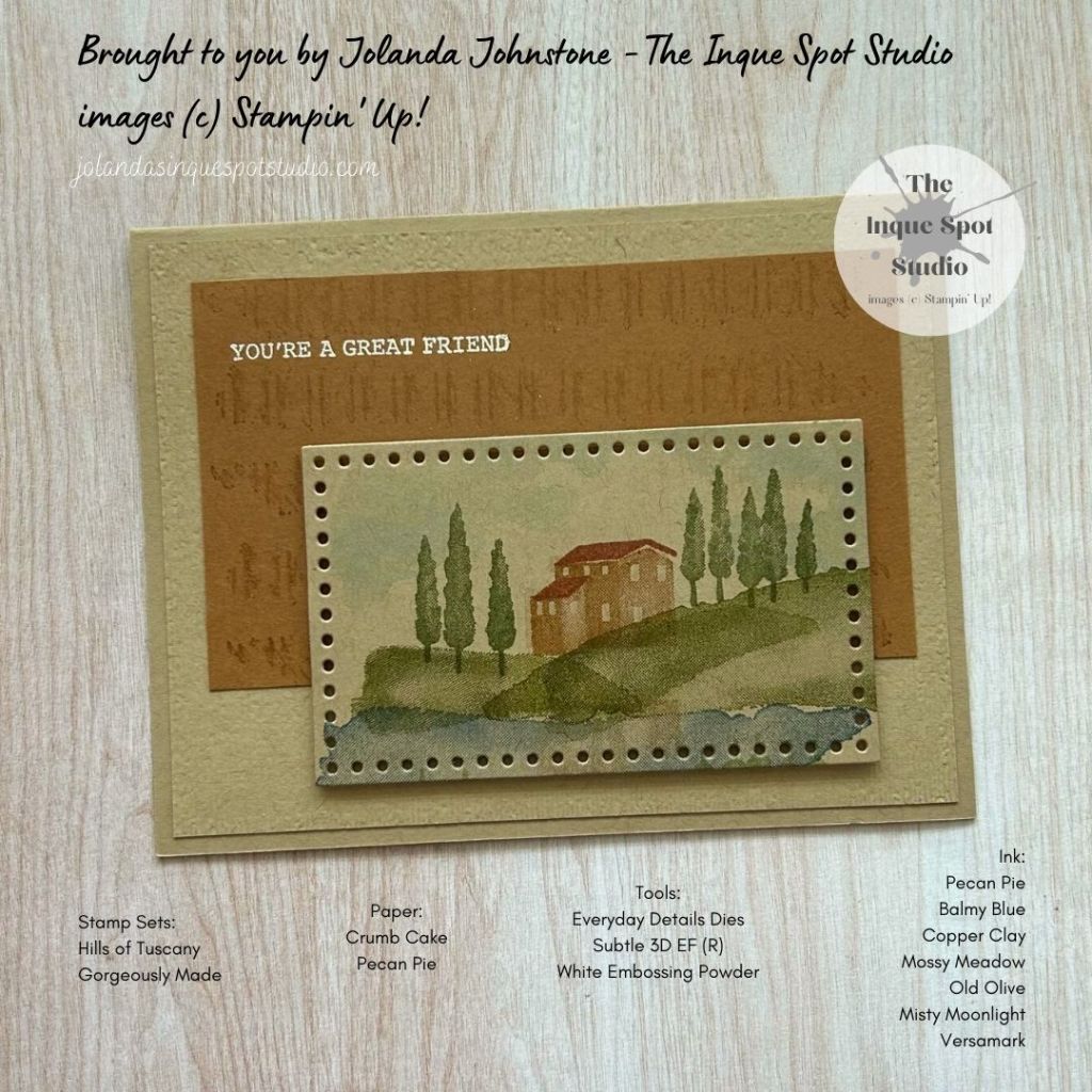 1. WOW! What a wouldn’t give to be in Tuscany right now! This scene is gorgeous! The embossed panel adds so much texture. Such a great masculine card, too!