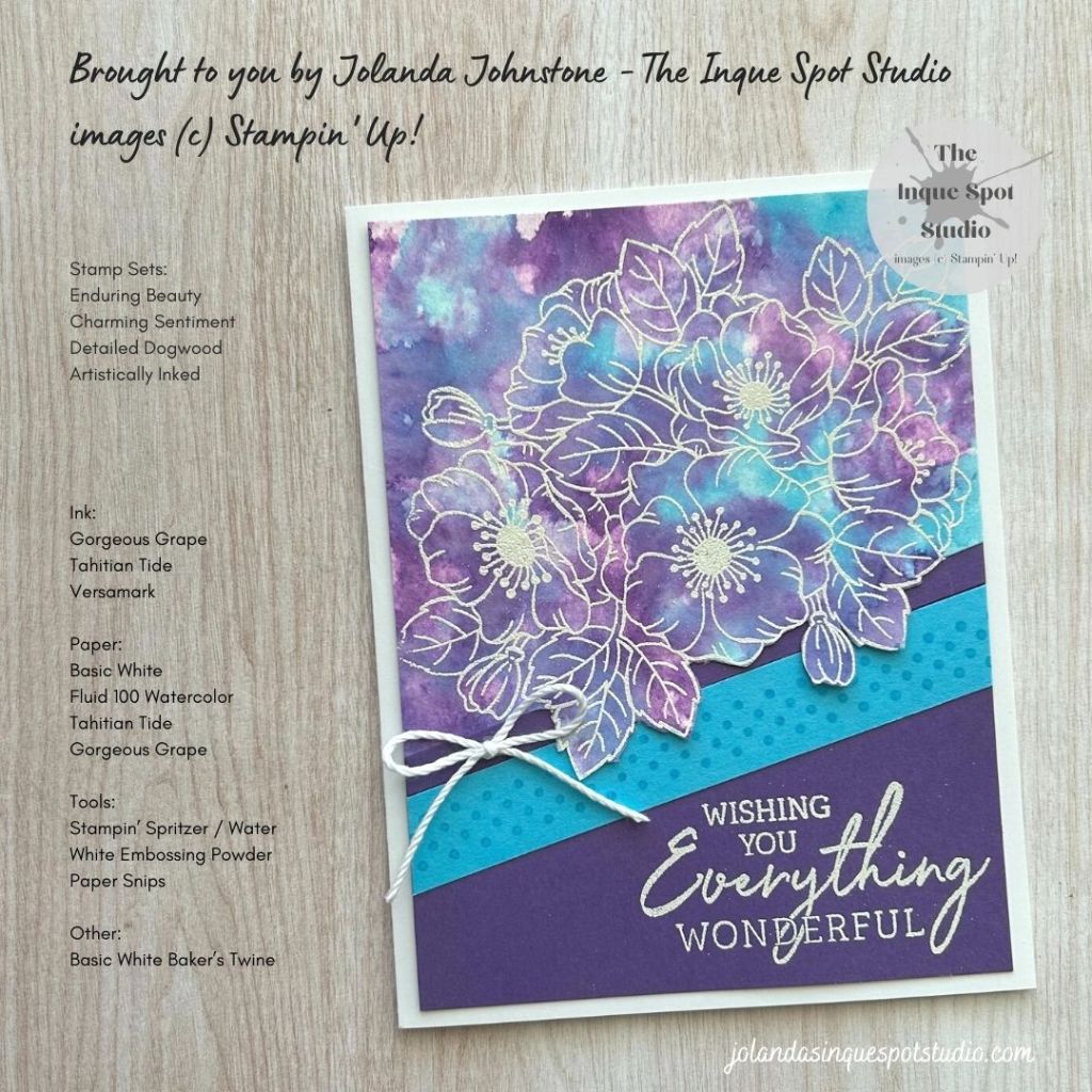 - Using the Watercolor Swirl image from the Artistically Inked stamp set, both Gorgeous Grape and Tahitian Tide inks were added randomly and overlapping.
