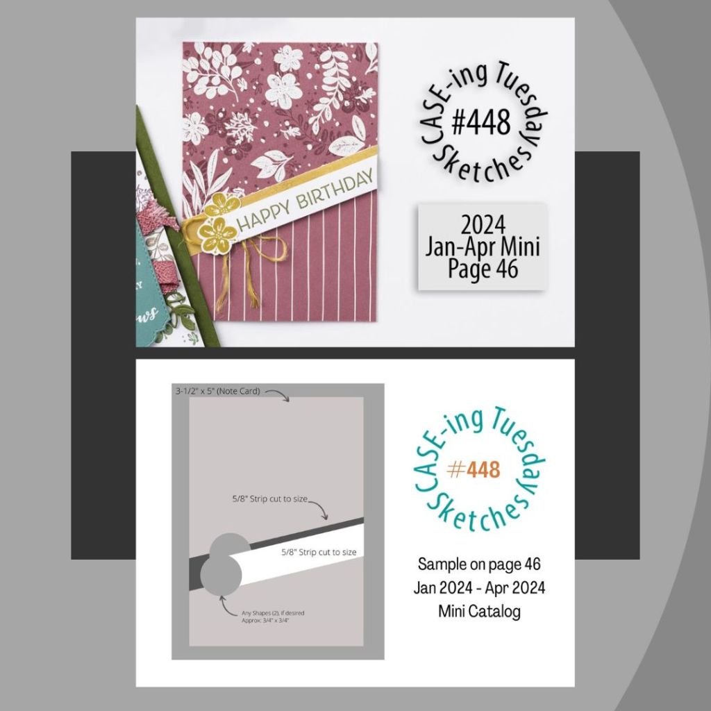 Hi! Back again for the Facebook Case-ing Tuesday (#448) sketch where we take a sample from a current Stampin’ Up! Catalog and change it up. A little or a lot. Today’s sample can be found on page 46 of the Jan – Apr Mini Catalog.