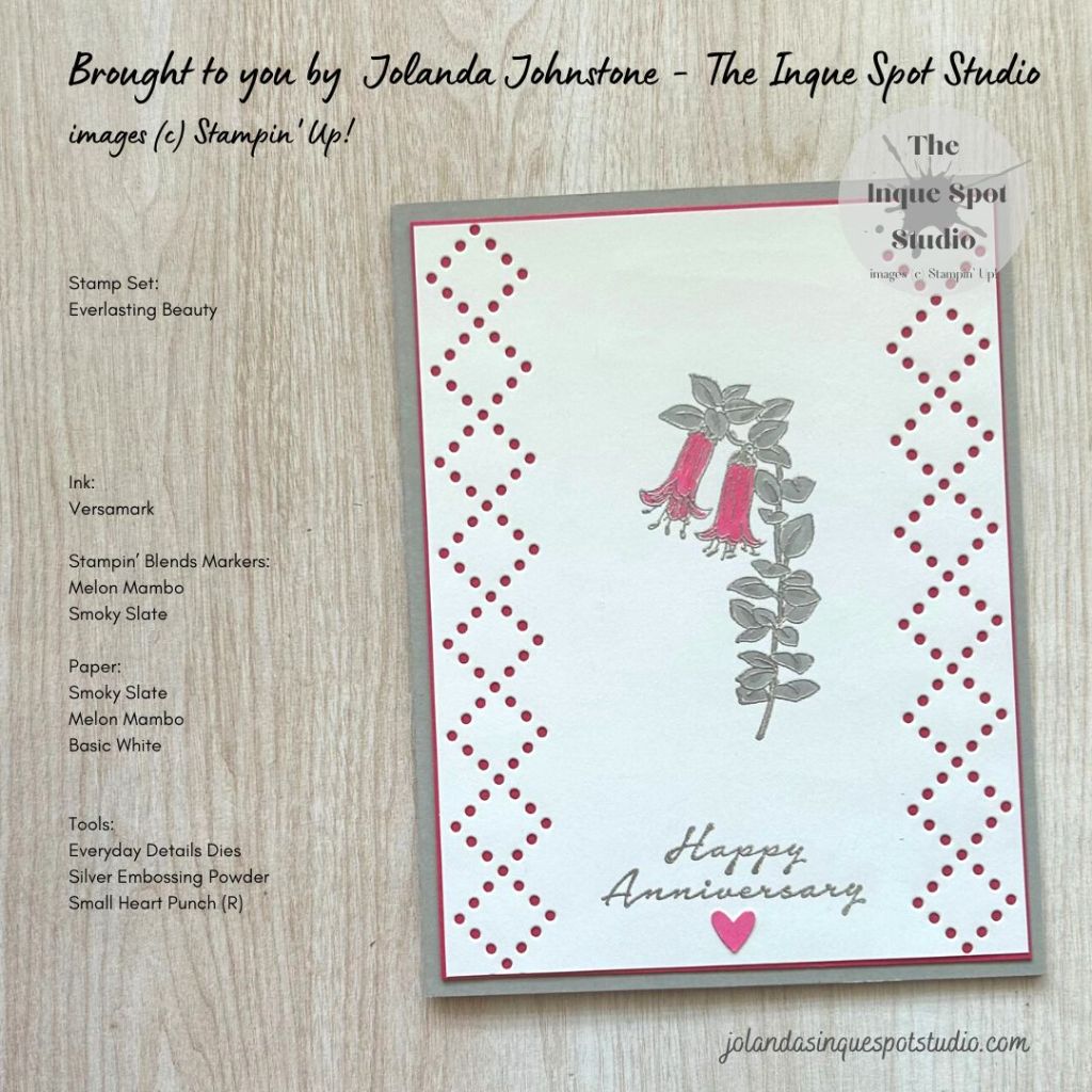 - The sentiment, Happy Anniversary, from the Everlasting Beauty stamp set was split in two and stamped in the bottom center position with Versamark ink and heat-set with Silver Embossing Powder.
