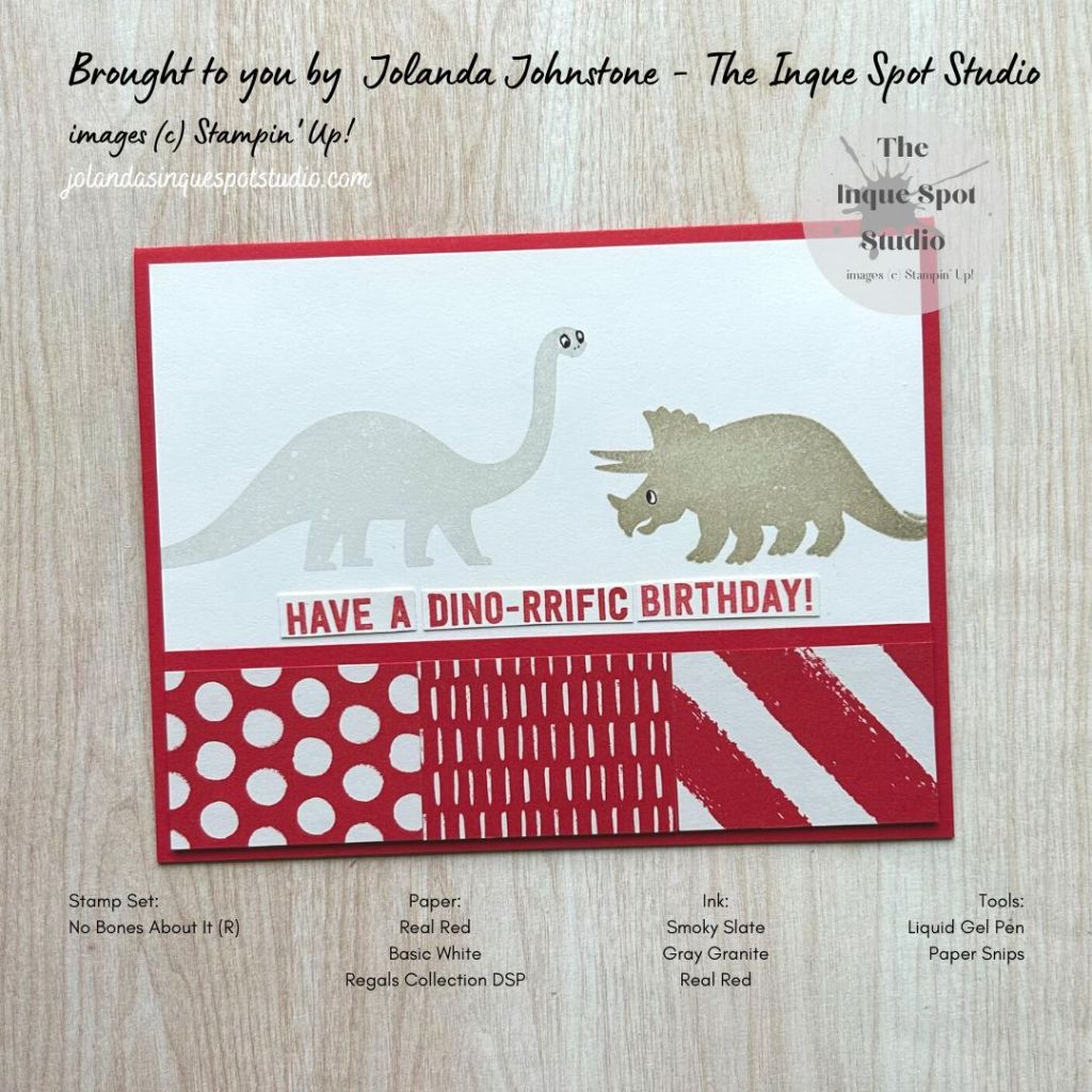 - The sentiment, Have a Dino-rrific Birthday, was stamped with Real Red ink. The three-line image was cut in sections with Paper Snips.