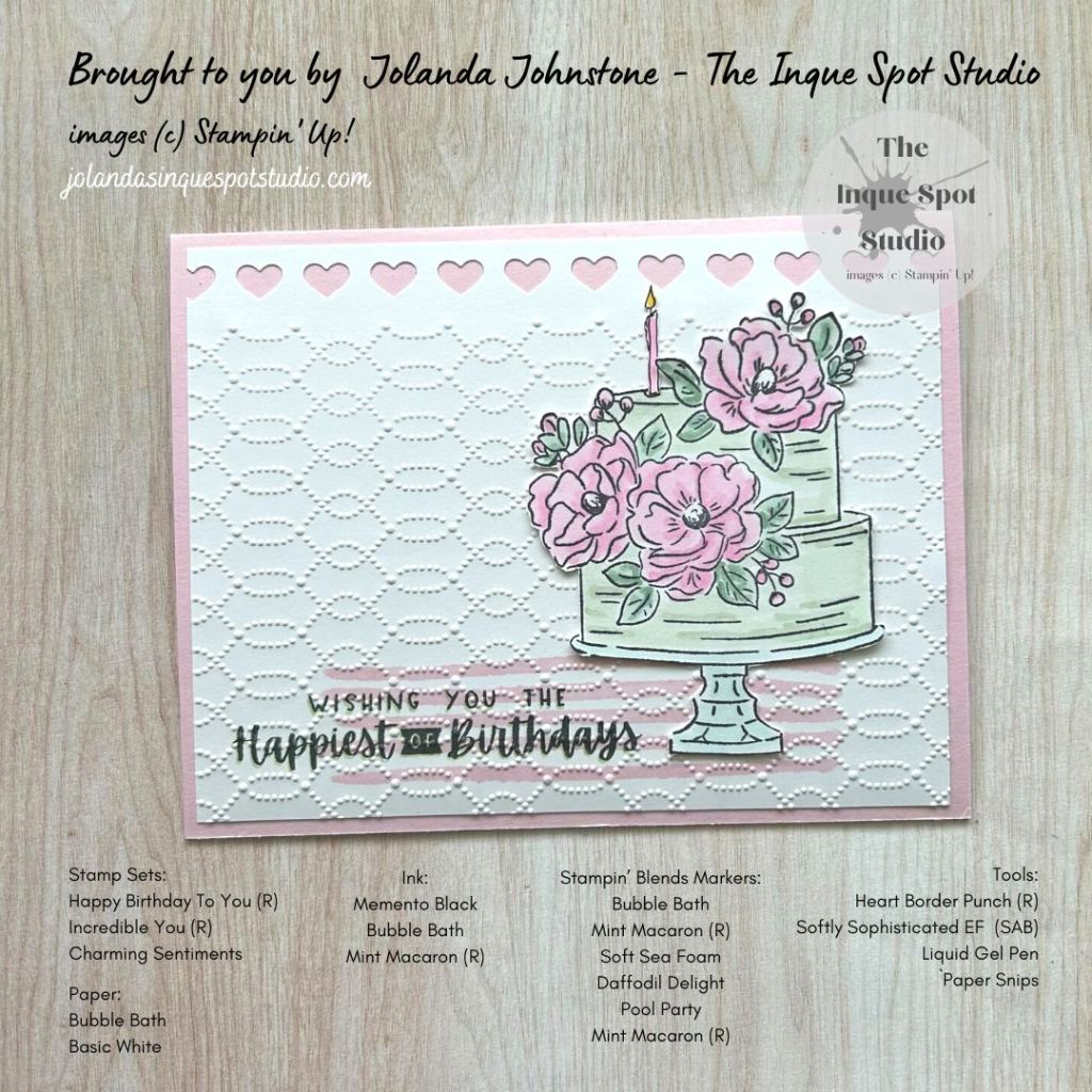 - The Floral Cake image from the retired Happy Birthday To You stamp set was stamped with Memento Tuxedo Black ink.