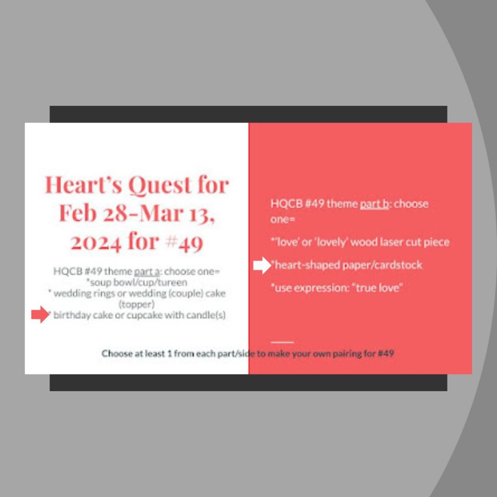 Oh my stars! Or should I say stripes? or hearts? or cake? I’m in awe of the background panel!!! Punched with heart border, stamped with the pink stripes and sentiment then embossed!!! Spectacular! The birthday cake is so lovely and you’ve given it a worthy backdrop! Magnificent!!! Thanks for using Heart’s Quest along with the color challenge and sketch challenge to create this wonderful card! –Becca