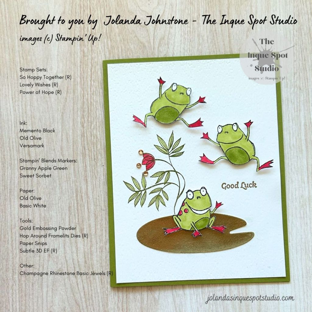 - All of the Frogs were colored with Stampin’ Blends Markers. Colors chosen: Light and Dark Granny Apple Green and Dark Sweet Sorbet to mimic the red feet and spots of the inspiration photo.