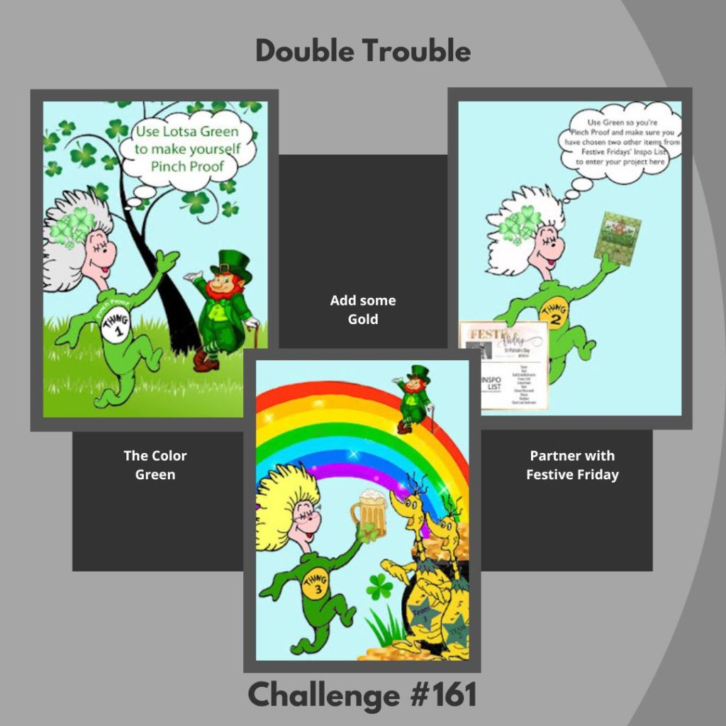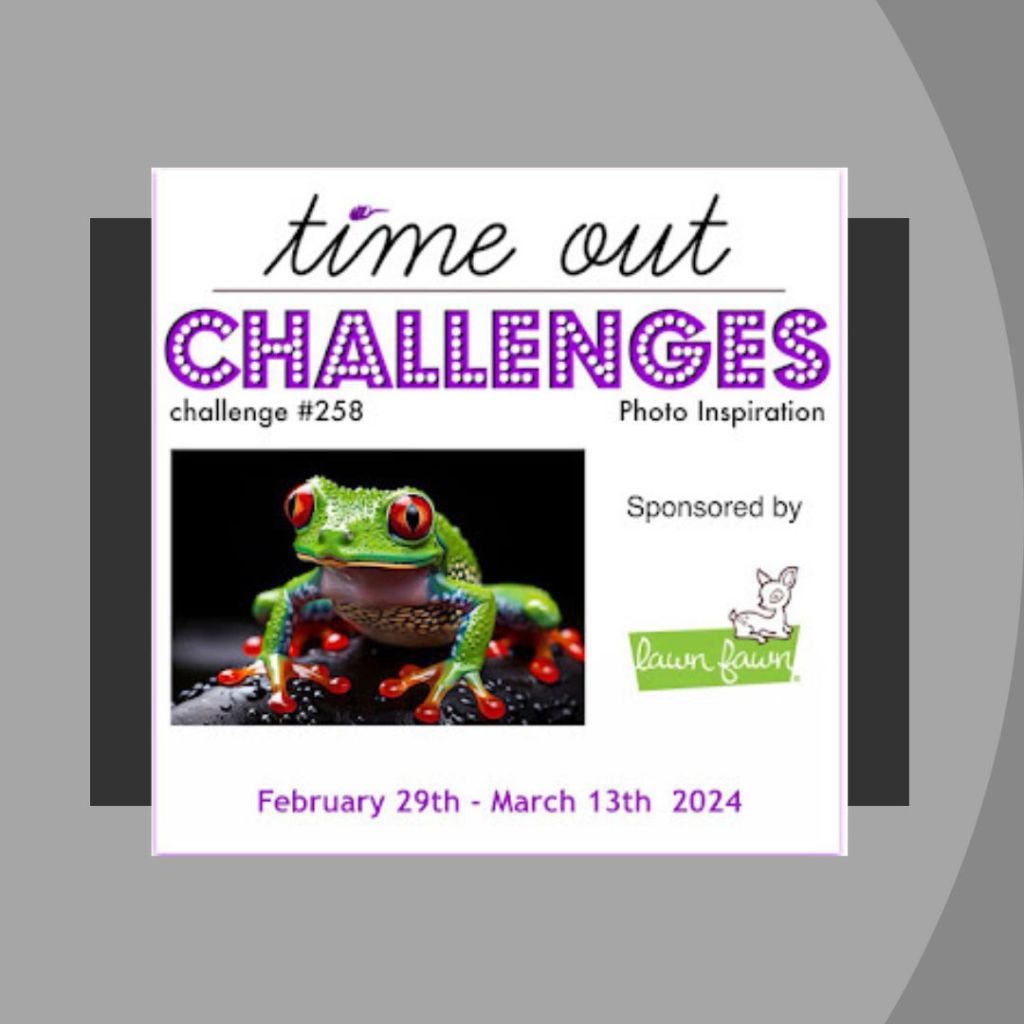 Festive Friday (#154) partnering with Double Trouble (#161) for theme and colors; Inspired By (#279) for theme, colors and sketch; Just Us Girls (#717) colors adding a bit of Red; and Time Out (#258) with the Glorious Green Frog. Did you know Frogs, Toads and Turtles are favorites of mine?