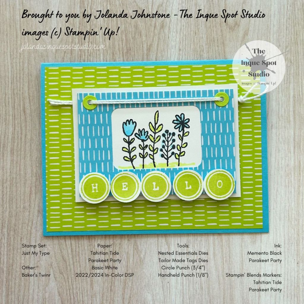 - The Type Keys – Hello image was stamped with Parakeet Party ink and then punched out with a (¾”) Circle Punch.