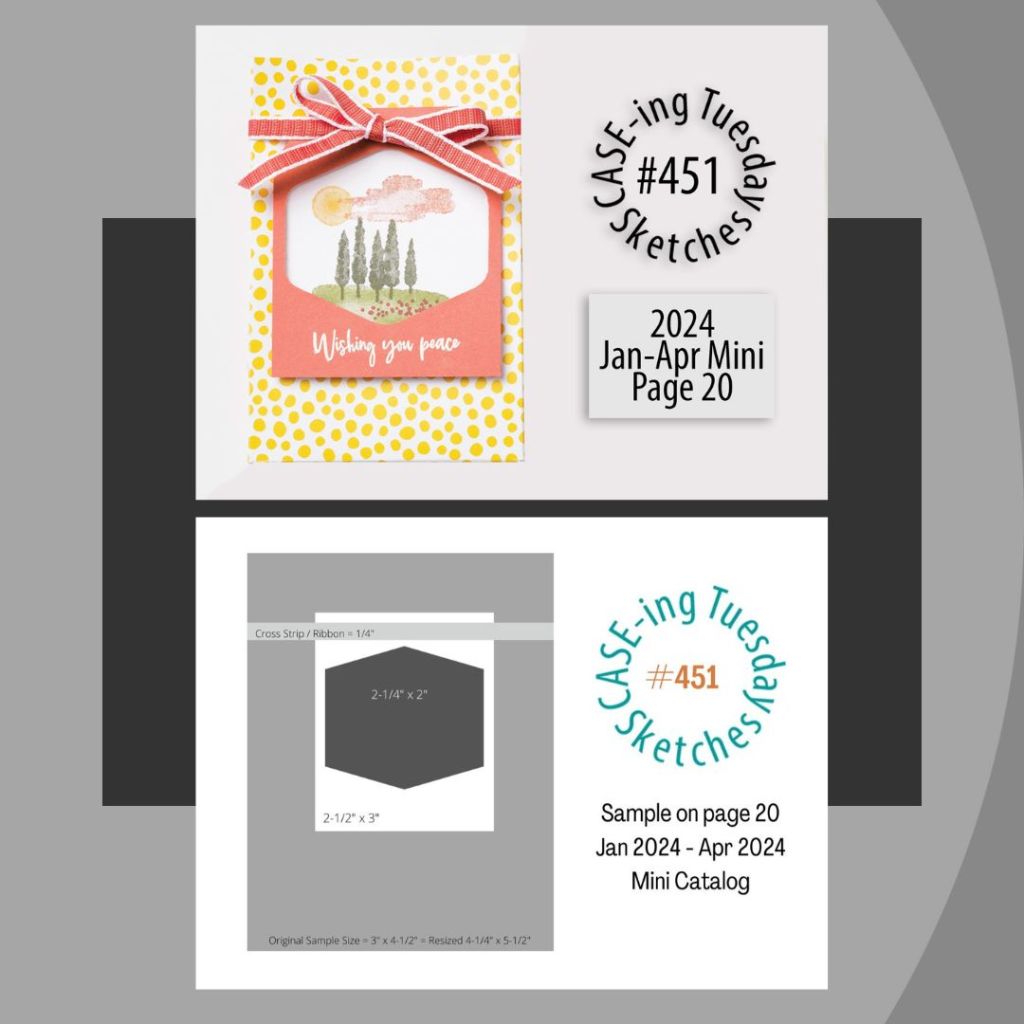 Let’s play!! It is Tuesday and time to create for this week’s Facebook Case-ing Tuesday (#451) featuring a treat package found on page 20 of the Jan – Apr Mini Catalog. The sketch has been altered to fit an A2 card and I flipped to the horizontal to better accommodate my design.
