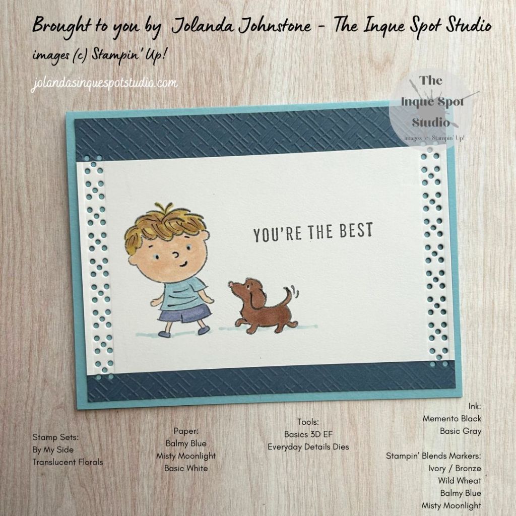 - The scene was colored with Stampin’ Blends Markers. Colors chosen: Skin and Puppy Nose – Ivory; Hair – Light Wild Wheat with Bronze highlights and a few doodles with a Black Uniball Micro Pen; T-Shirt – Light Balmy Blue; Short and Shoes – Light Misty Moonlight (for the Grey tone); Puppy – Bronze; and Shadows – Light Balmy Blue (also for a Grey tone).