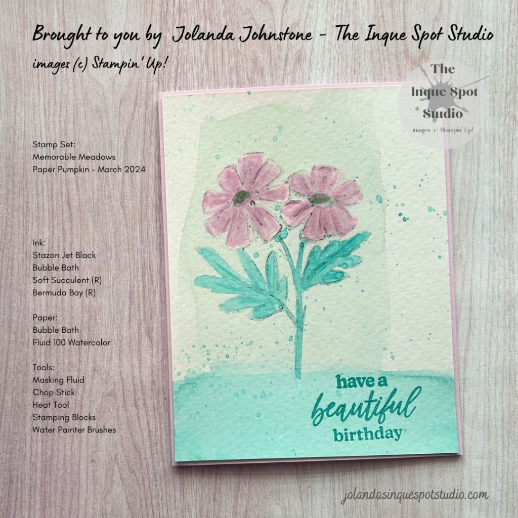 - The Floral image from the current March 2024 Paper Pumpkin Kit – Memorable Meadows was stamped with Stazon Jet Black ink. The image came out spotty and gray, but I had to go with it!