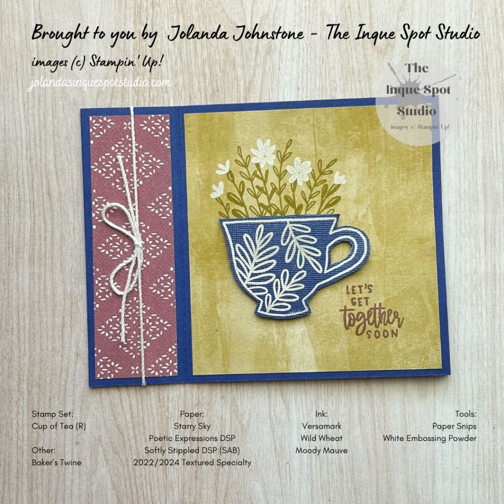 All elements were adhered to the card base to resemble the flipped sketch. Basic White Baker’s Twine was tied in a Bow and added to the Side Book Panel and the Tea Cup was popped up with Dimensionals.