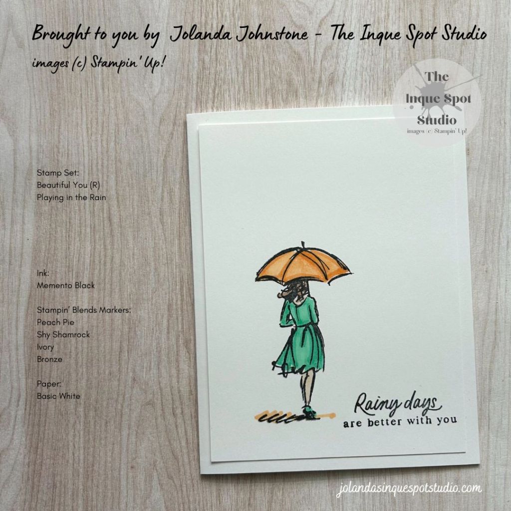 - The Girl was colored with Stampin’ Blends Markers. Colors chosen: Umbrella and Ground – Light and Dark Peach Pie; Dress and Shoes – Light Shy Shamrock; Skin – Ivory: and Hair – Bronze.