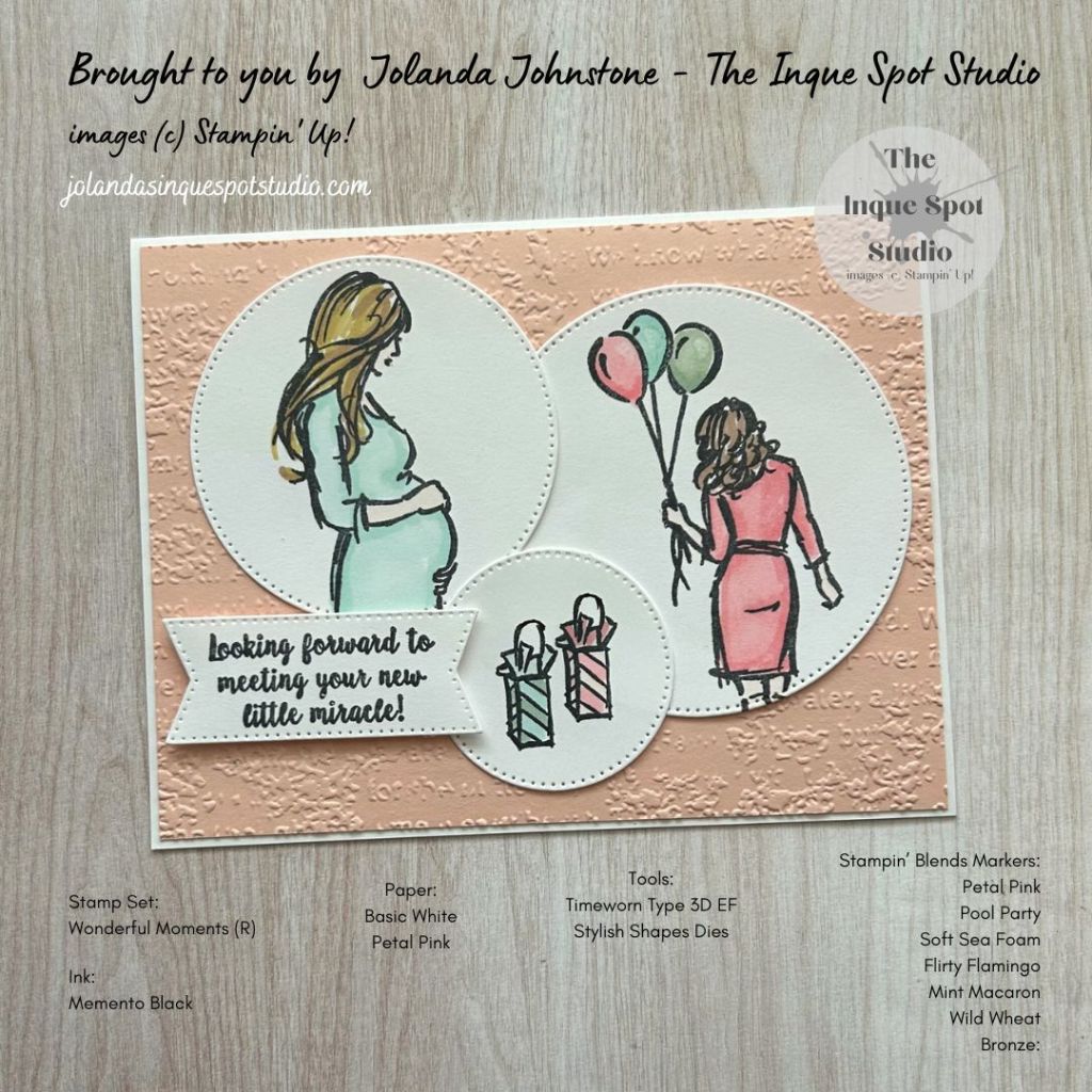- (2½”) The Expectant Mother image from the retired Wonderful Moments stamp set was stamped with Memento Tuxedo Black ink and colored with Stampin’ Blends Markers. Colors chosen: Hair – Light Wild Wheat and Bronze; Skin – Light Petal Pink; and Dress – Light and Dark Pool Party.