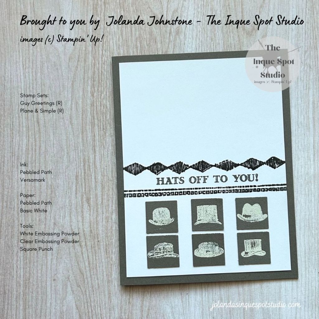 - The sentiment, Hats Off To You!, from the retired Guy Greetings stamp set was stamped between the lines with Pebble Path ink.