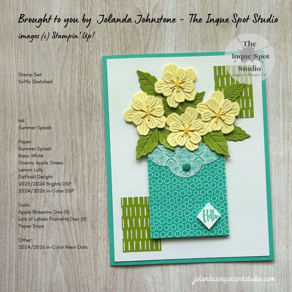 - The greeting, Hello, from the Softly Sketched stamp set was stamped with Summer Splash ink and trimmed in the diamond shape with Paper Snips.