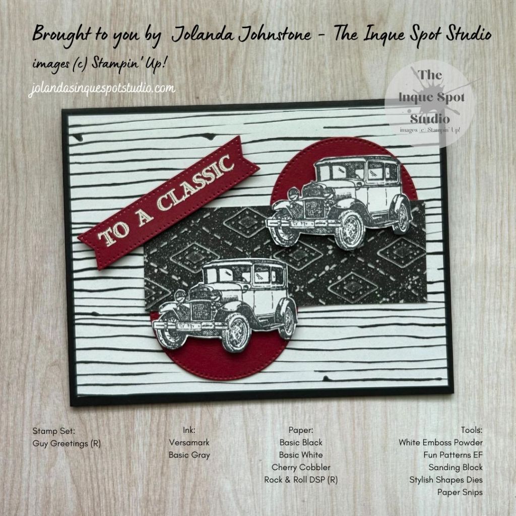 - The sentiment, To A Classic, was stamped with Versamark ink and heat-set with White Embossing Powder.