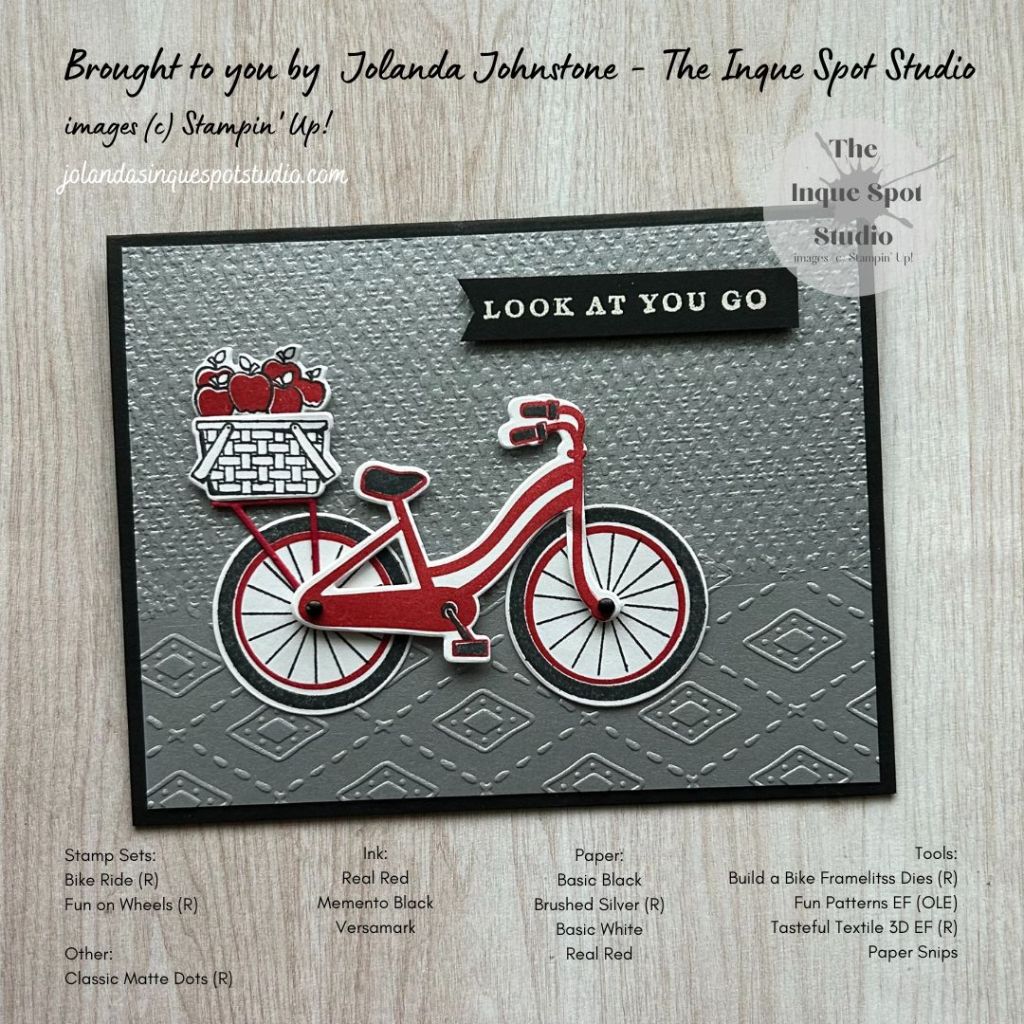 Love the red bike and the basket of apples! The 2 different textures are great and really add a lot of interest. Thank you for stamping along with the Festive Friday challenge!