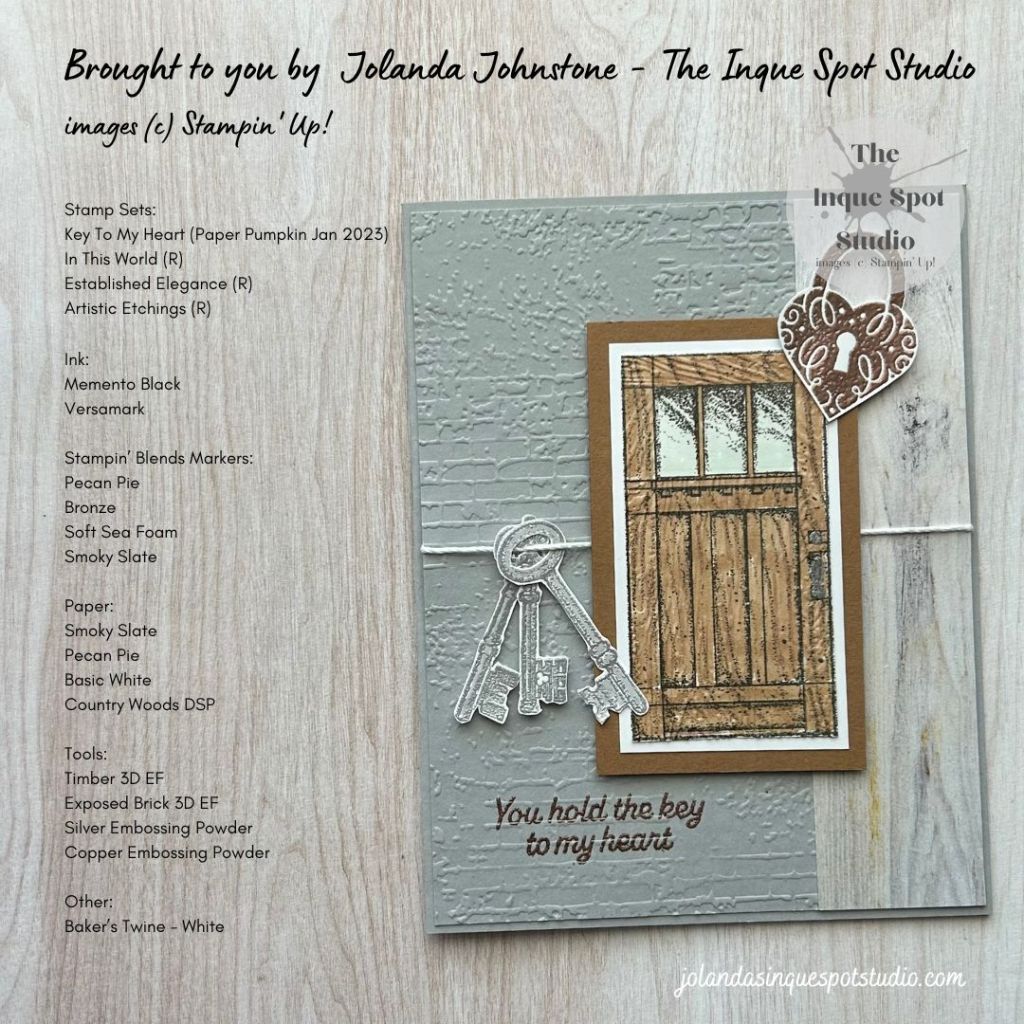- The sentiment, You hold the key to my heart, from the January 2023 Paper Pumpkin Kit – Key To My Heart, was stamped with Versamark ink and heat-set with Copper Embossing Powder.