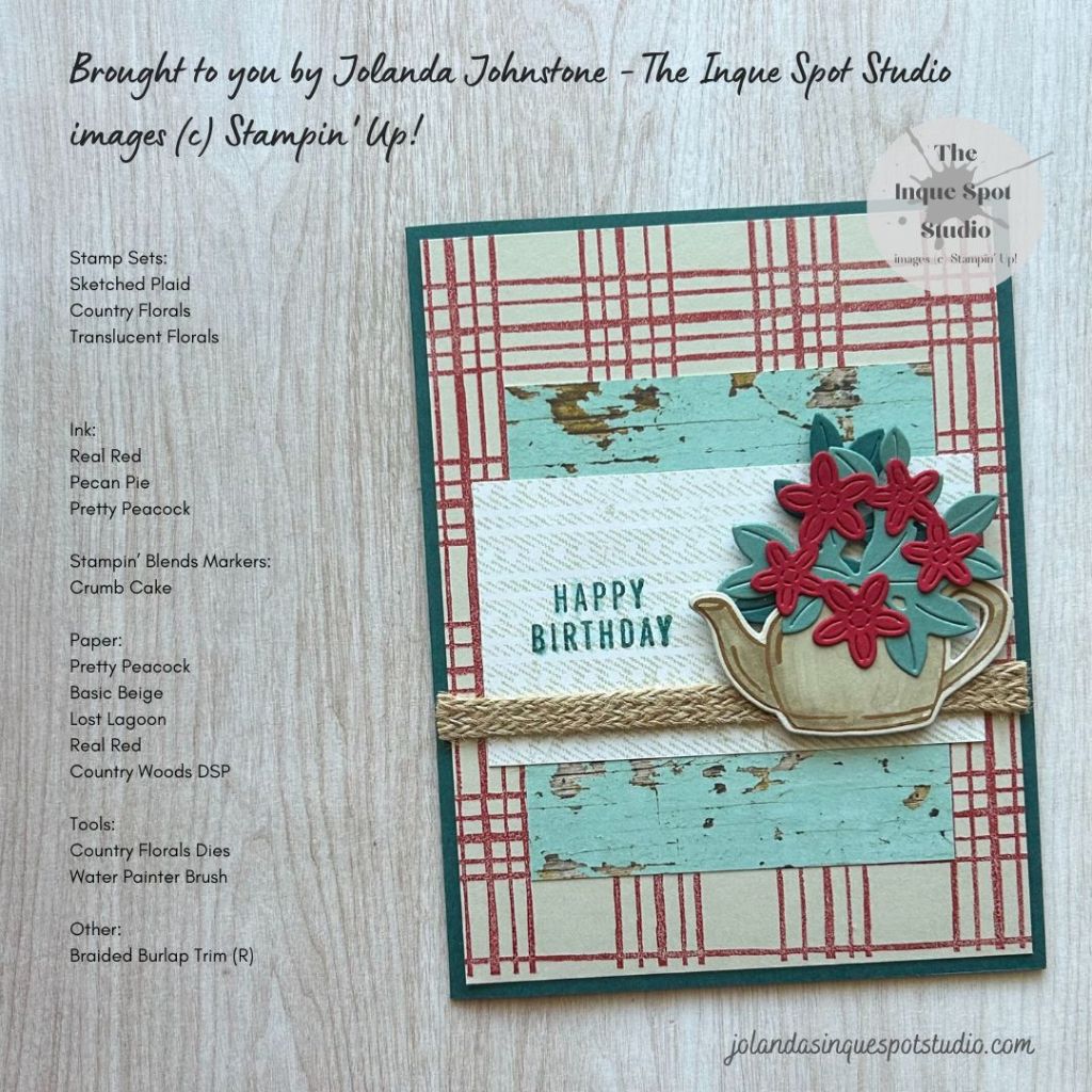 All elements were adhered to the card base to resemble the sketch. A piece of retired Braided Burlap Trim was added and the Teapot was popped up with Dimensionals.