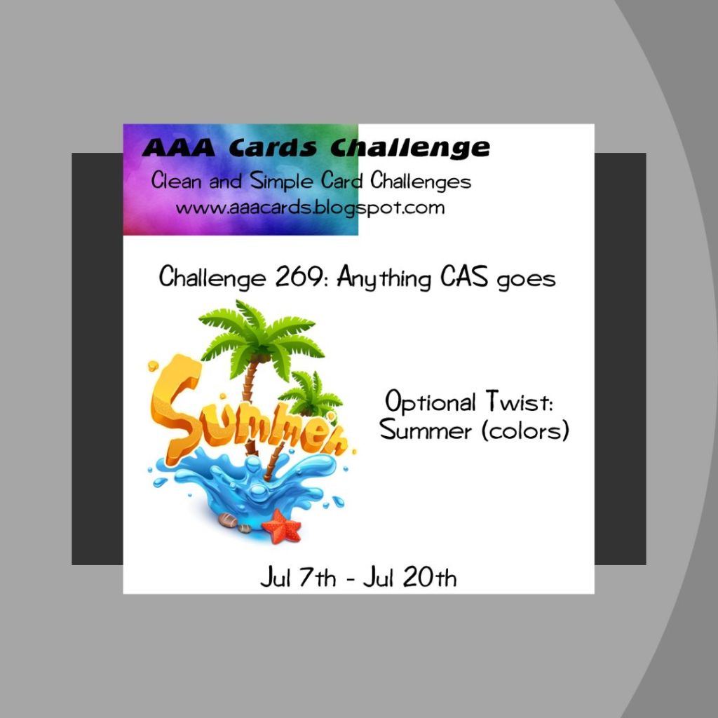 Keeping the card design minimal, I am sharing it with Addicted to CAS (#262) Summer Theme; AAA Cards (#269) Summer Colors; Shopping Our Stash (#526) Summer Theme; and Krafty Chicks (#725) to create a clean and simple card.