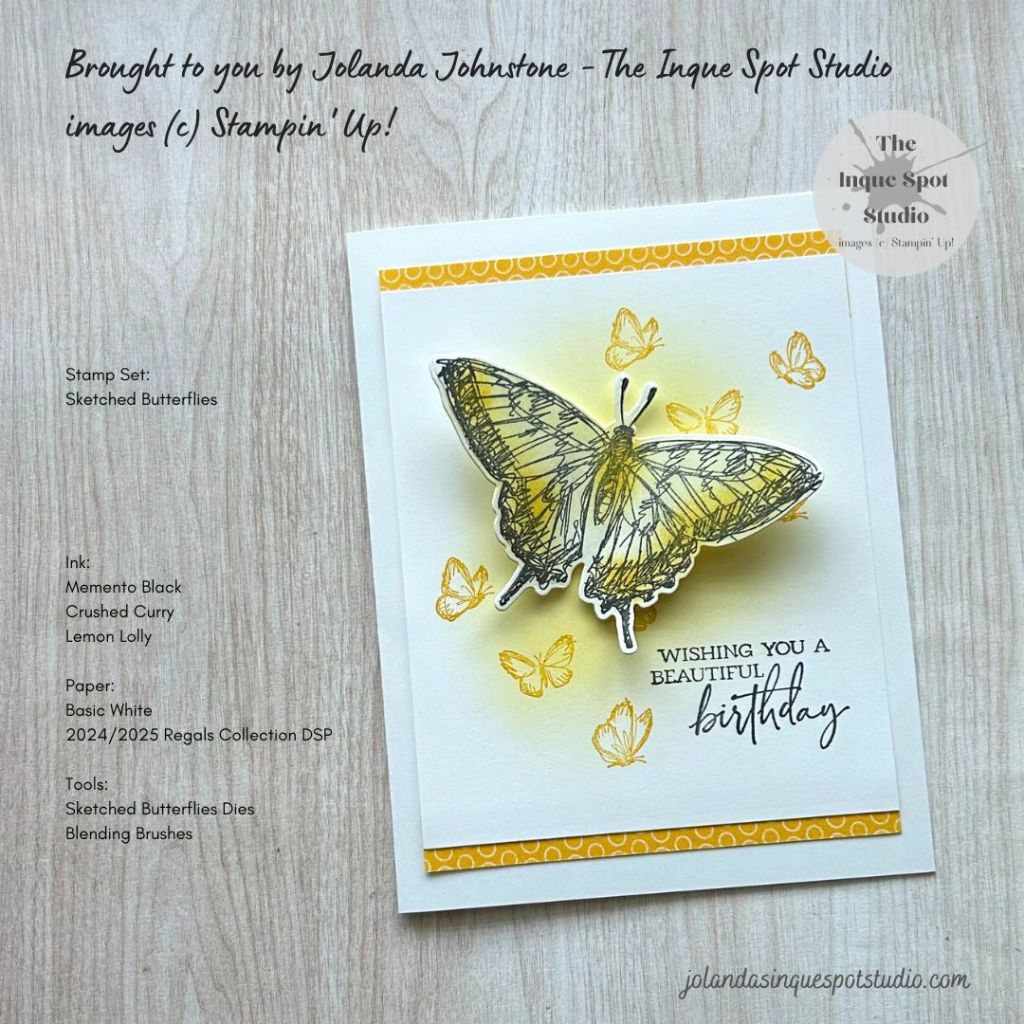 - The large Butterfly image was stamped with Memento Tuxedo Black ink and colored with both Lemon Lolly and Crushed Curry inks applied with Blending Brushes.