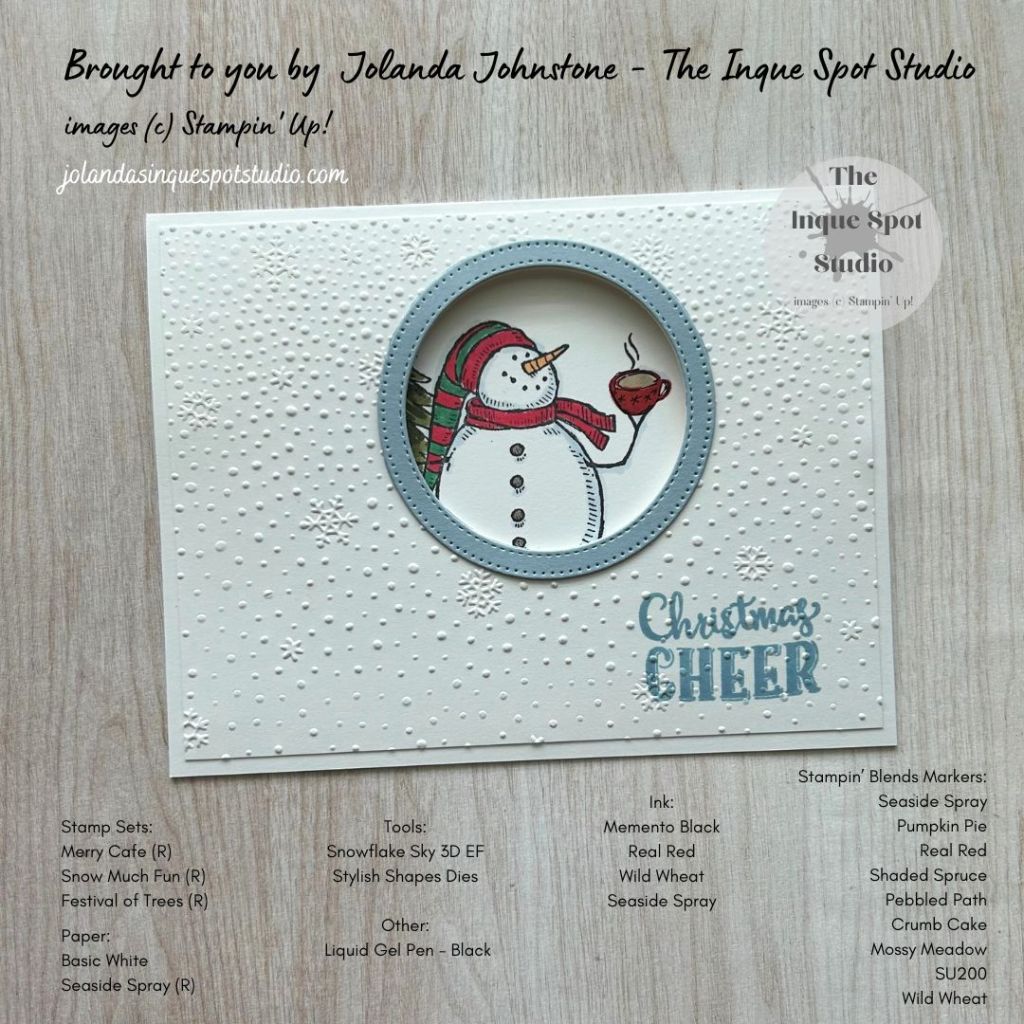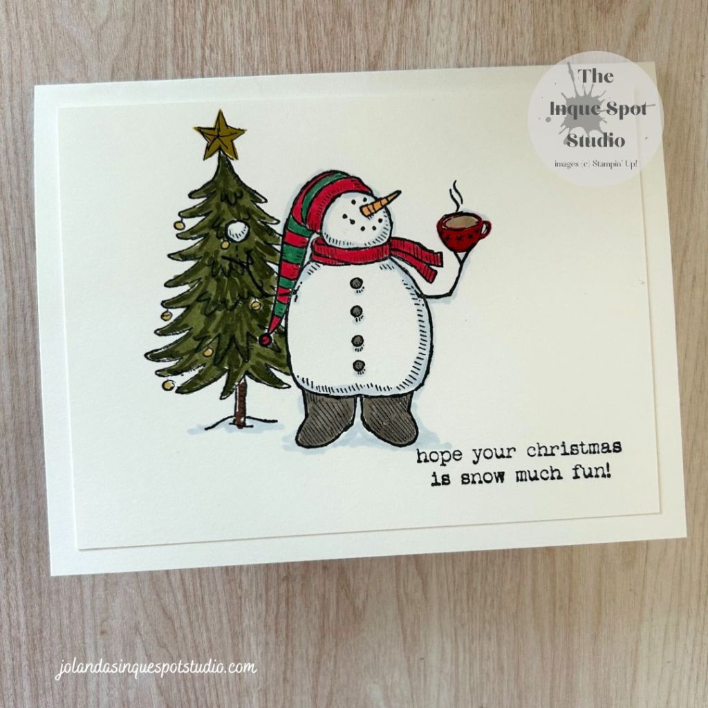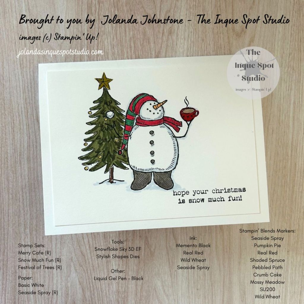- The scene was colored with Stampin’ Blends Markers. Colors chosen: Snowman’s Body and Shadow Details – Light Seaside Spray; Nose – Light Pumpkin Pie; Scarf – Light Real Red; Hat – Light Real Red and Shaded Spruce; Buttons and Boots – Light Pebbled Path; Coffee – Light Crumb Cake; Tree – Light and Dark Mossy Meadow, Baubles – Light Wild Wheat; and Tree Trunk – SU200.