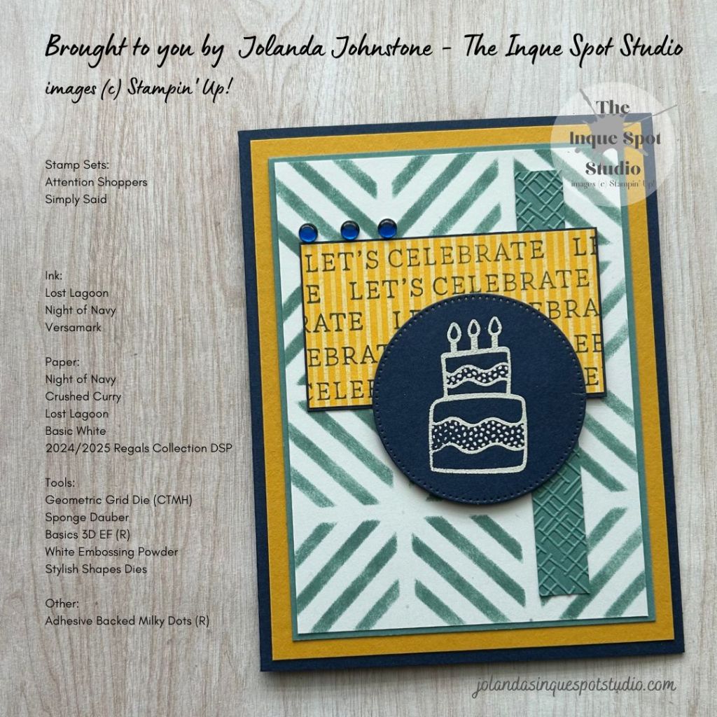 - The Birthday Cake image from the Attention Shoppers stamp set was stamped with Versamark ink and heat-set with White Embossing Powder and then die-cut with the (2⅛”) Stitched Circle die from the Stylish Shapes Dies set.