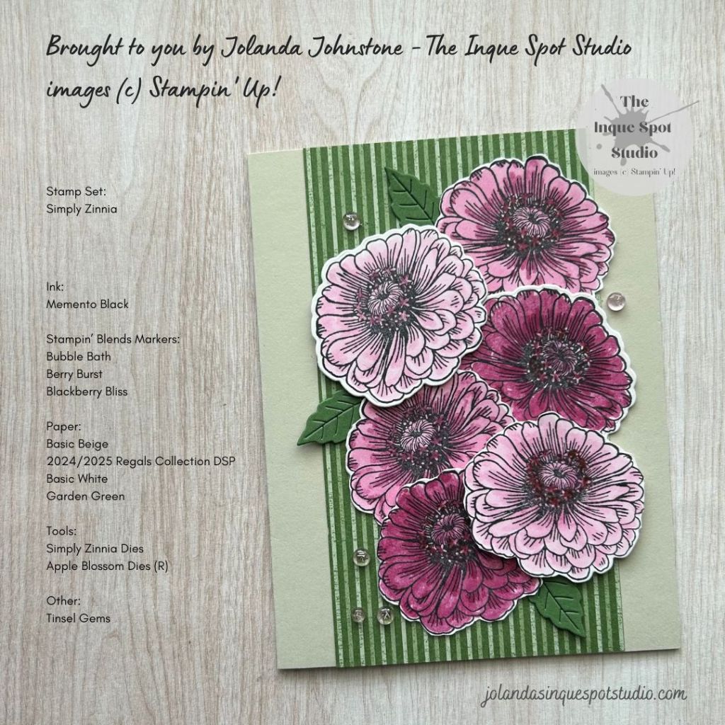 - The Zinnia Flower image from the Simply Zinnia stamp set, an On-Line Exclusive product, was stamped six times.The Zinnias were colored with Stampin’ Blends Markers. Colors: Light and Dark Bubble Bath, Berry Burst and Blackberry Bliss.