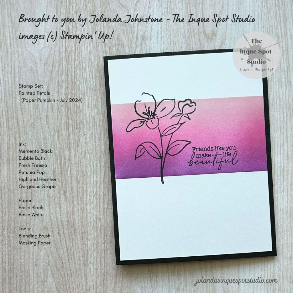 • The Masking Paper was removed and the Floral image and the sentiment, Friends like you make life beautiful, from the Painted Petals stamp set found in the July 2024 Paper Pumpkin Kit was stamped with Memento Tuxedo Black ink.