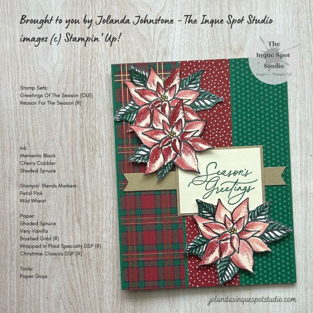 • The Poinsettia Outline image from the retired Reason For The Season stamp set was stamped three times with Memento Tuxedo Black ink. The Poinsettia Petals and Floral Centers were colored, respectively with the Light Petal Pink and Light Wild Wheat Stampin’ Blends Markers. The Poinsettia In-Fill image and the Leaves In-Fill image was stamped with Cherry Cobbler and Shaded Spruce inks, respectively.