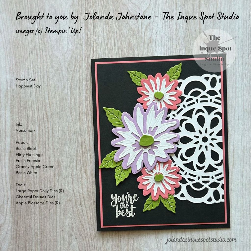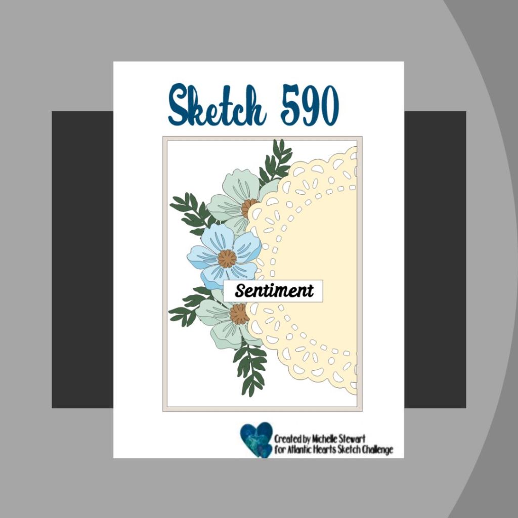 So pretty. Love the choice of the black background. It really makes the flowers and doily pop. The decision to add a bit of the flirty flamingo was also a great choice. Thanks for joining us at Atlantic Hearts Sketch Challenge.