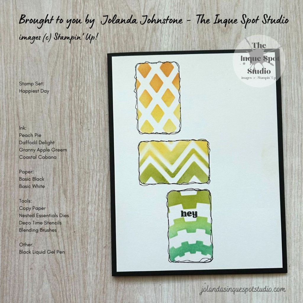 - Daffodil Delight ink and Granny Apple Green inks were applied with Blending Brushes using a Chevron Zig Zag Stencil.