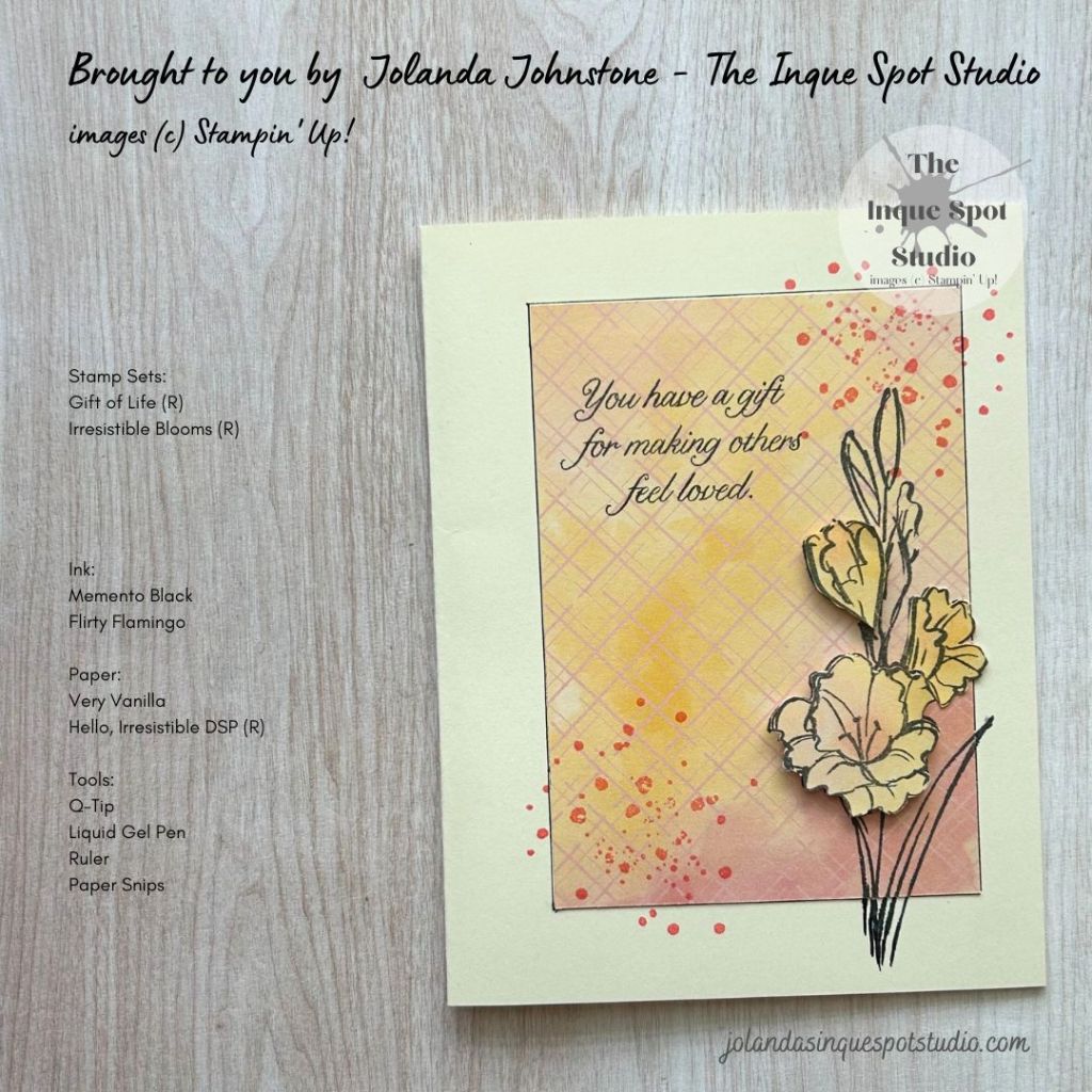 - The Panel was adhered back in place and the Splatter image from the now retired Irresistible Blooms stamp set was added in the upper right and lower left corners with Flirty Flamingo ink.