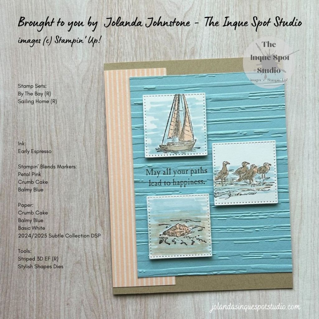 - The Seashell and the Waterbirds images from the By The Bay stamp set and the Sailboat image from the retired Sailing Home stamp set were stamped with Early Espresso ink and colored with Stampin’ Blends Markers. Colors chosen: Light Petal Pink, Crumb Cake and Balmy Blue.