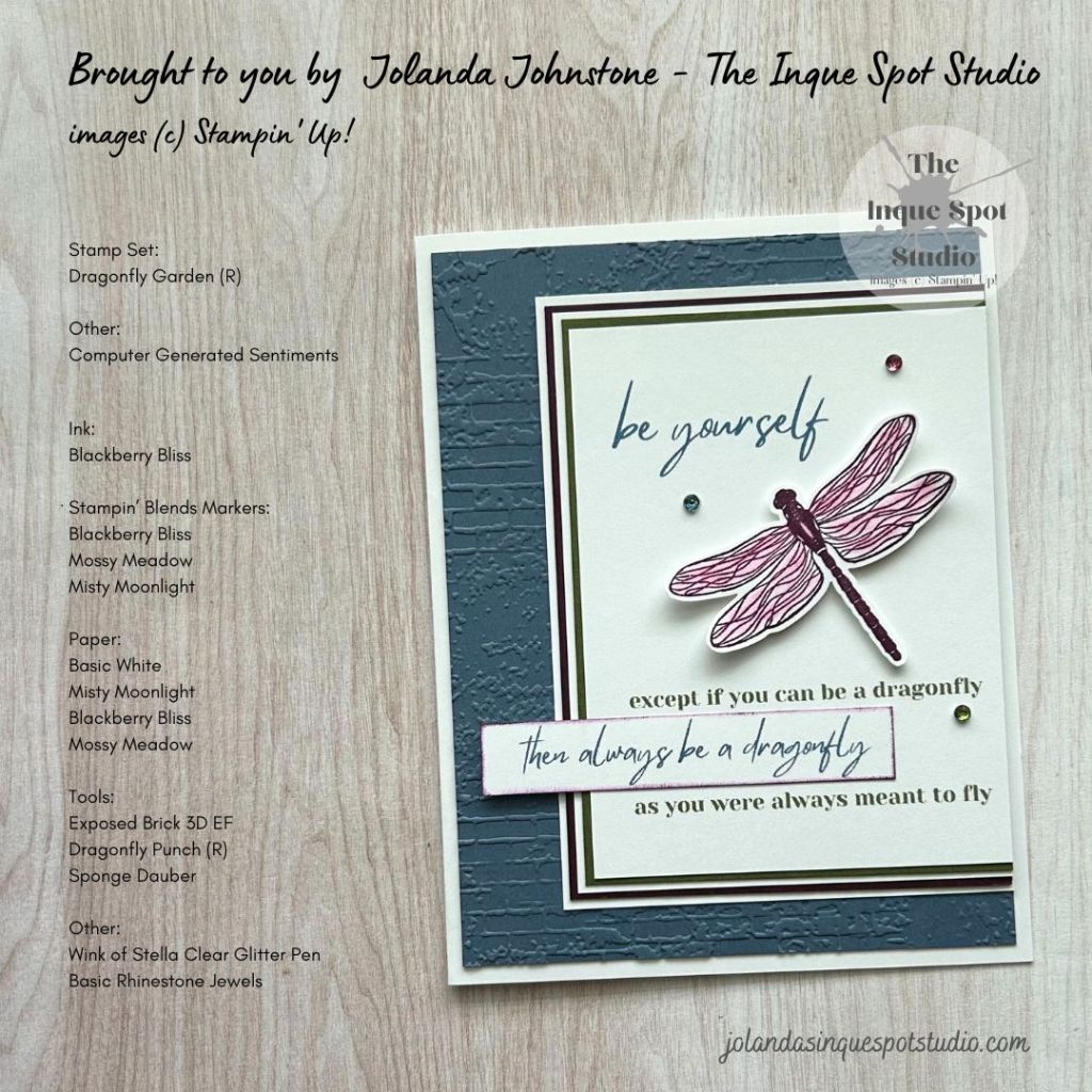 All elements were adhered to the card base to resemble the sketch. Three Basic Rhinestone Jewels were colored with the Dark Blackberry Bliss, Misty Moonlight and Mossy Meadow Stampin’ Blends Markers and added for a bit of bling and the Dragonfly was popped up with Dimensionals.
