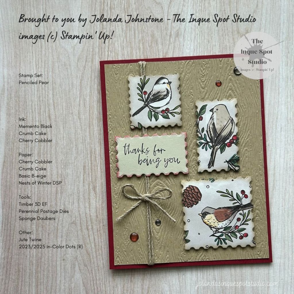 1. Beautiful, Jolanda! Crumb Cake and Cherry Cobbler coordinate perfectly with the birds. This is such amazing designer paper. I love the vintage/country vibe. It’s a card that gives a person the “warm fuzzies”!