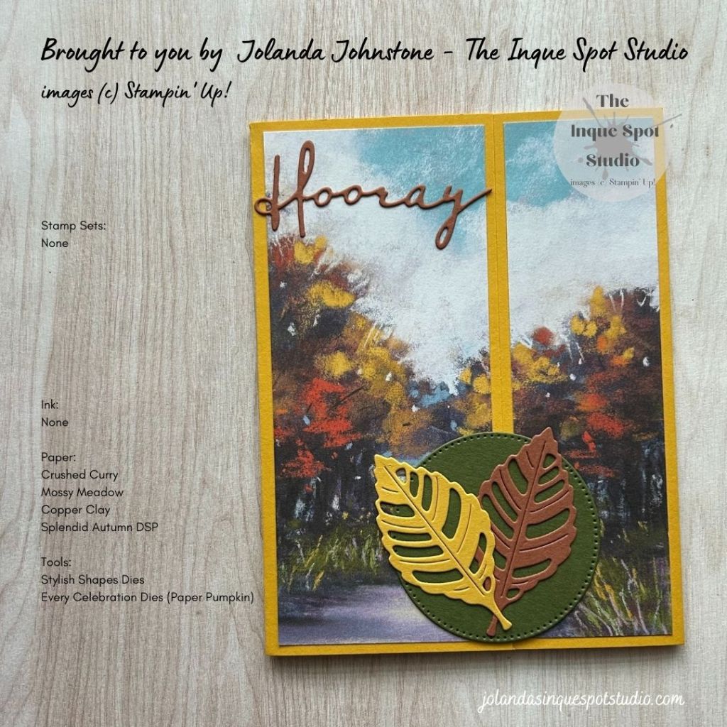 - Background Panels: (2¼” x 5¼”) and (1½” x 5¼”) Split Panel Autumn Tree Path patterned piece of paper from the Splendid Autumn Designer Series Paper.