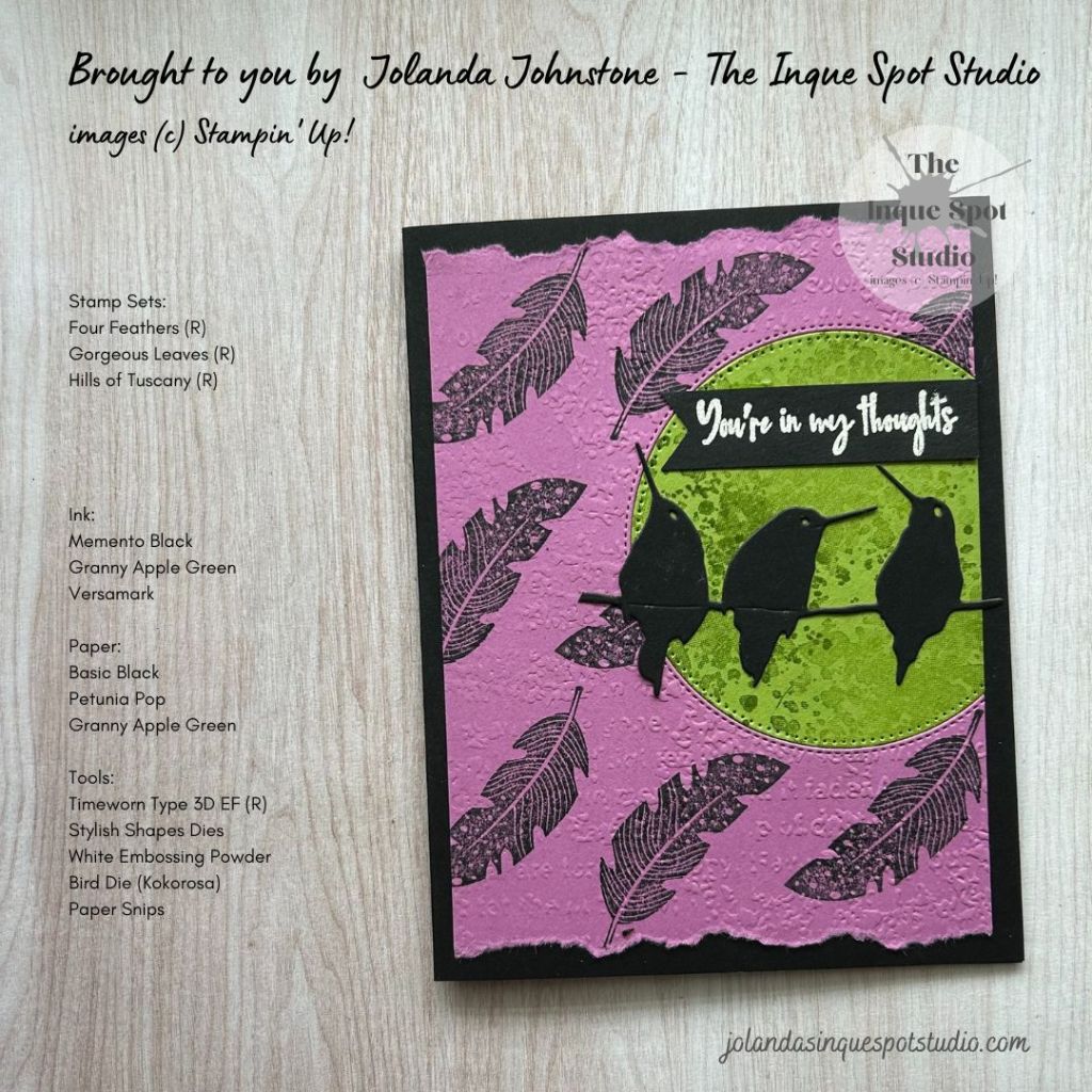 - The Feather image from the retired Four Feathers stamp set was stamped with Memento Tuxedo Black ink.